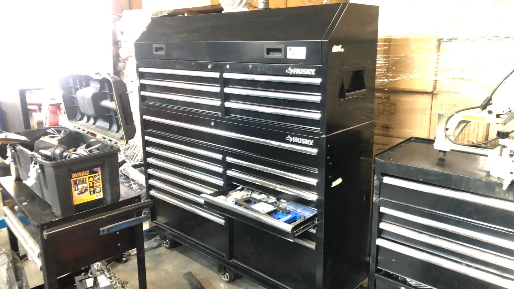 BLACK HUSKY MOBILE MULTI-DRAWER TOOL CABINET W/ SMALL AUTOBODY TOOLS AND SUPPLIES D18" X W60" X H64" NO KEY