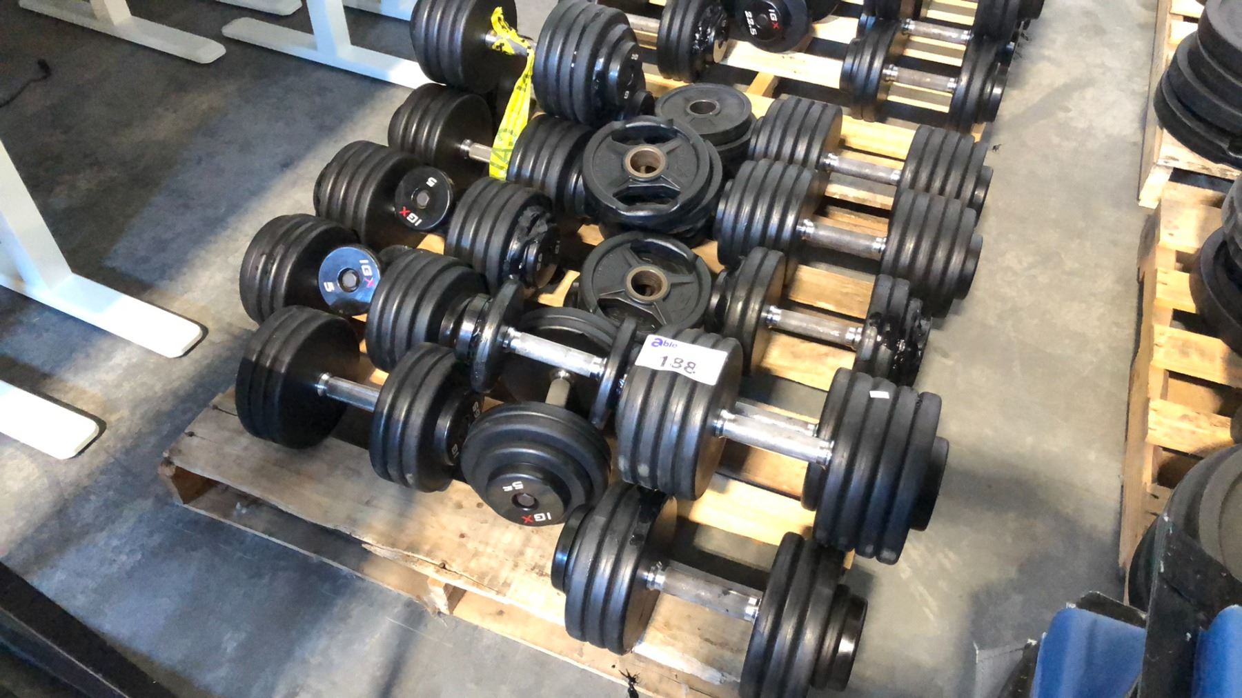BLACK IGX APPROX. 16 DUMBBELLS AND 15 WEIGHT PLATES WEIGHT CATEGORY DUMBBELLS-85LBS , 2 OF 80LBS, 70LBS, 50LBS, 2 OF 100LBS, 65 LBS, 2 OF 95LBS, 2 OF 90 55LBS AND WEIGHT PLATES-4 OF 5LBS, 6 OF 10LBS, 5 OF 2.5LBS