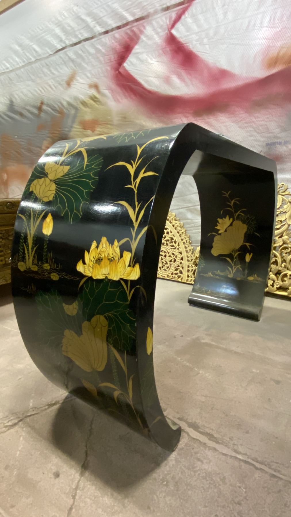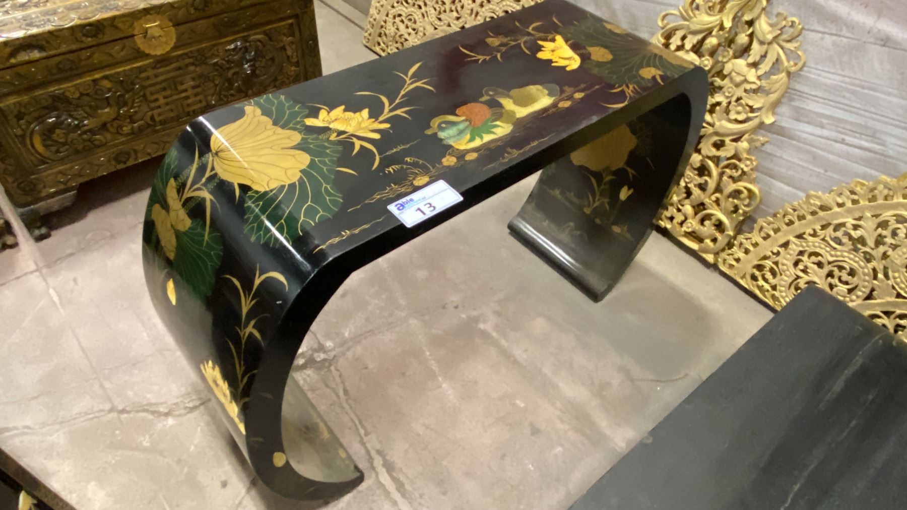 BLACK LACQUER WITH PAINTED FLORAL & WILDLIFE HALL OR SOFA TABLE