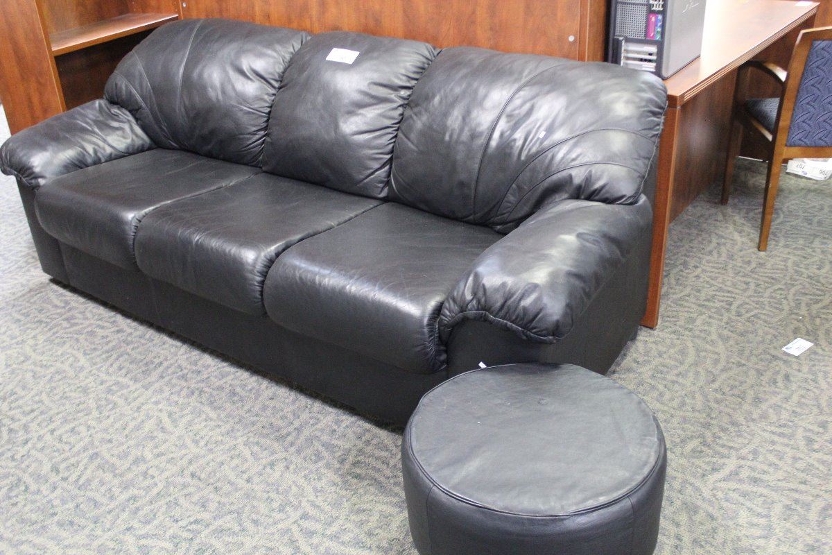 BLACK LEATHER 3 SEAT SOFA WITH 2 MATCHING OTTOMANS