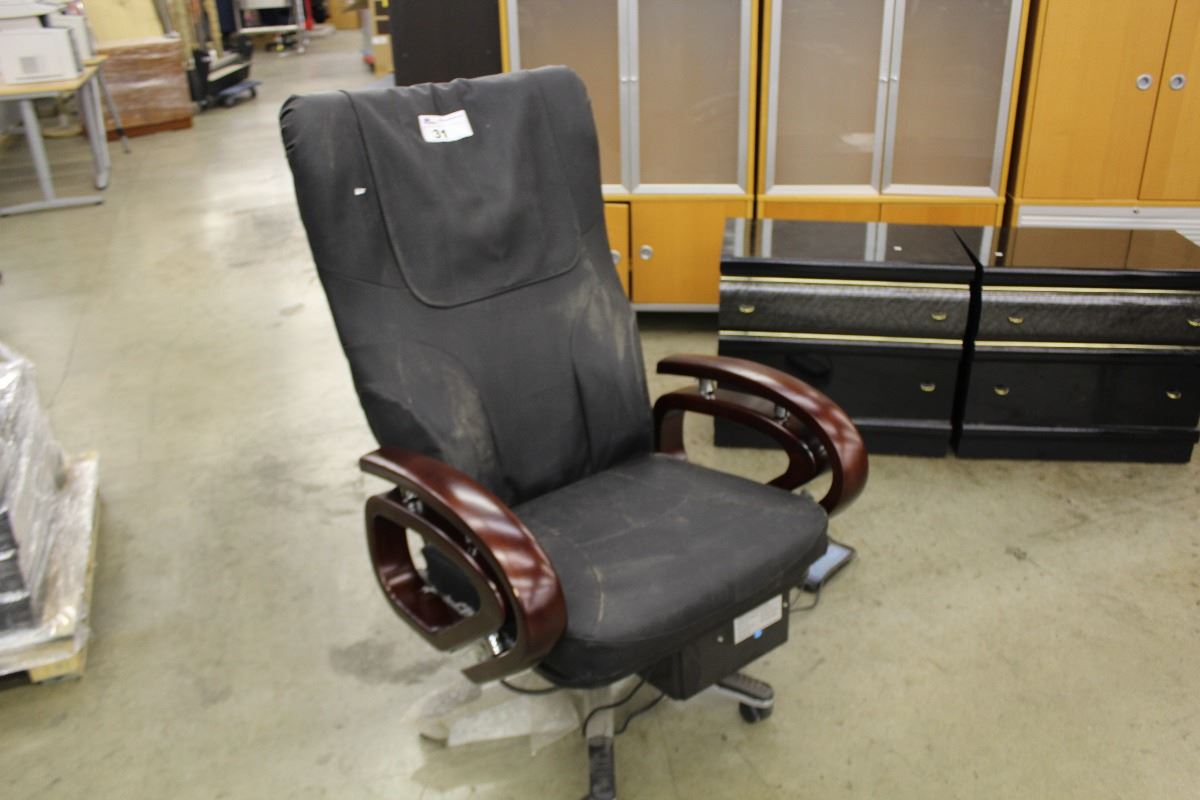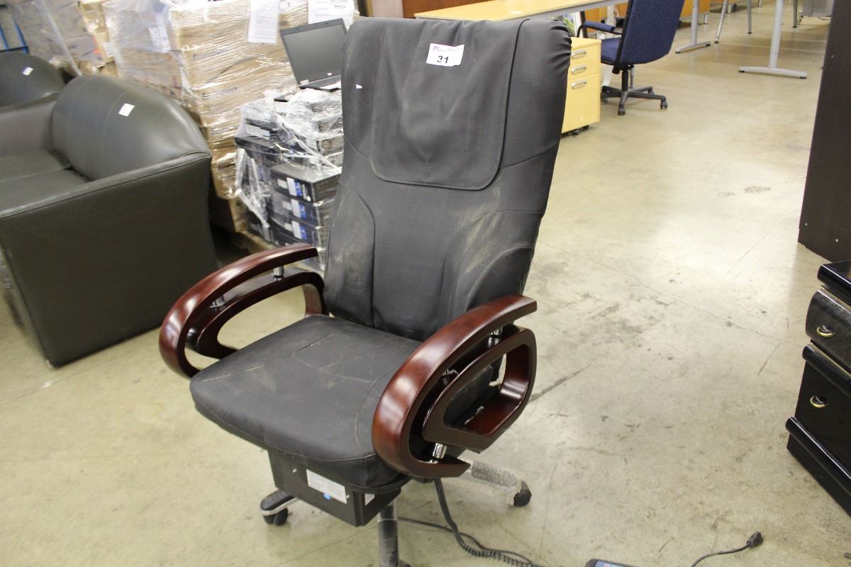 BLACK LEATHER AND MAHOGANY FRAME MOBILE EXECUTIVE MASSAGE CHAIR