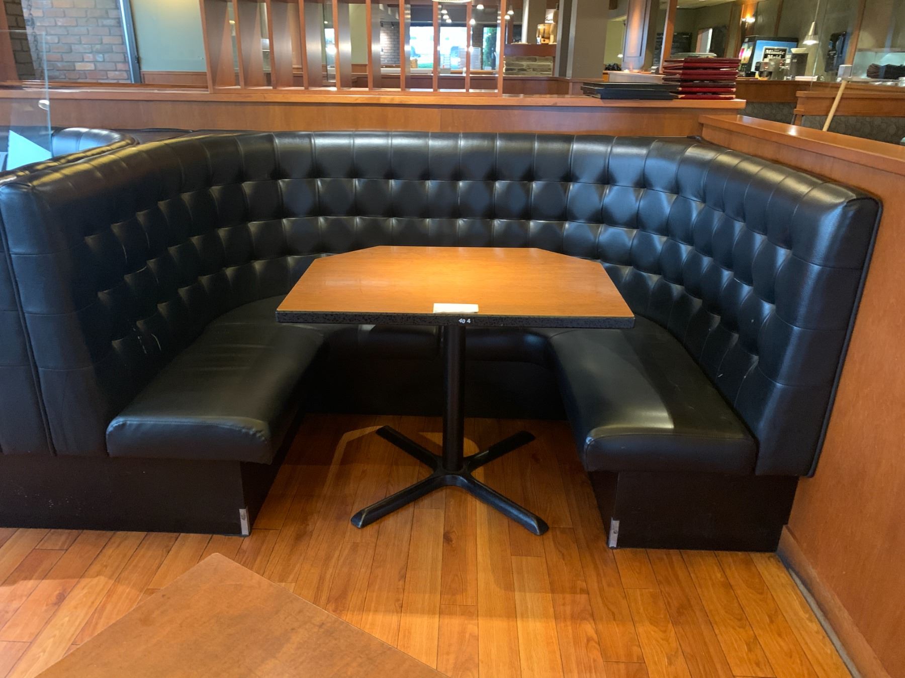 BLACK LEATHER APPROX. 55"D X 84"W 43"H VINYL RESTAURANT U-SHAPED BOOTH WITH DARK WOOD METAL BASE RESTAURANT TABLE *REQUIRED TO DISMANTLE*