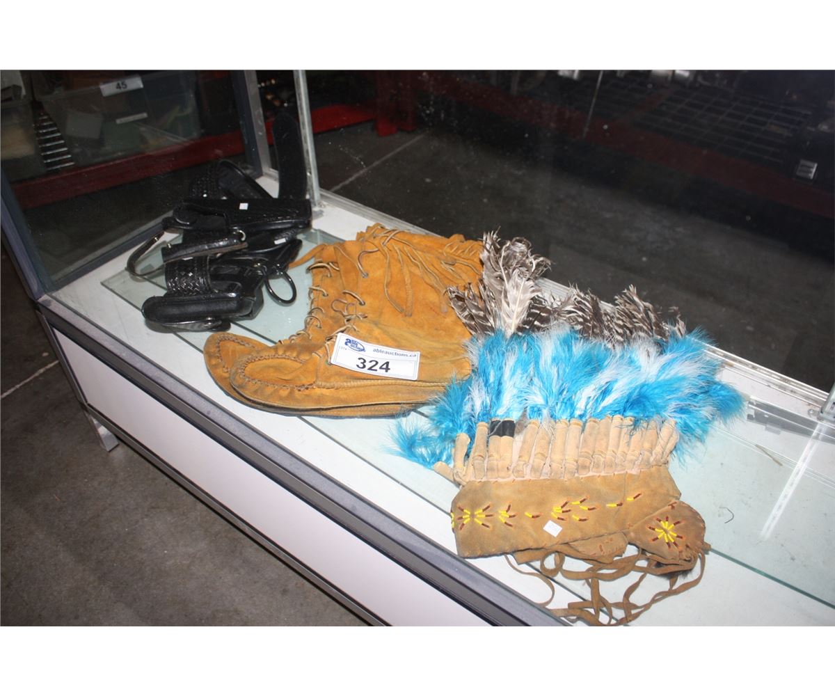 BLACK LEATHER GUN BELT, PAIR OF MOCCASINS AND LEATHER NATIVE HEAD DRESS