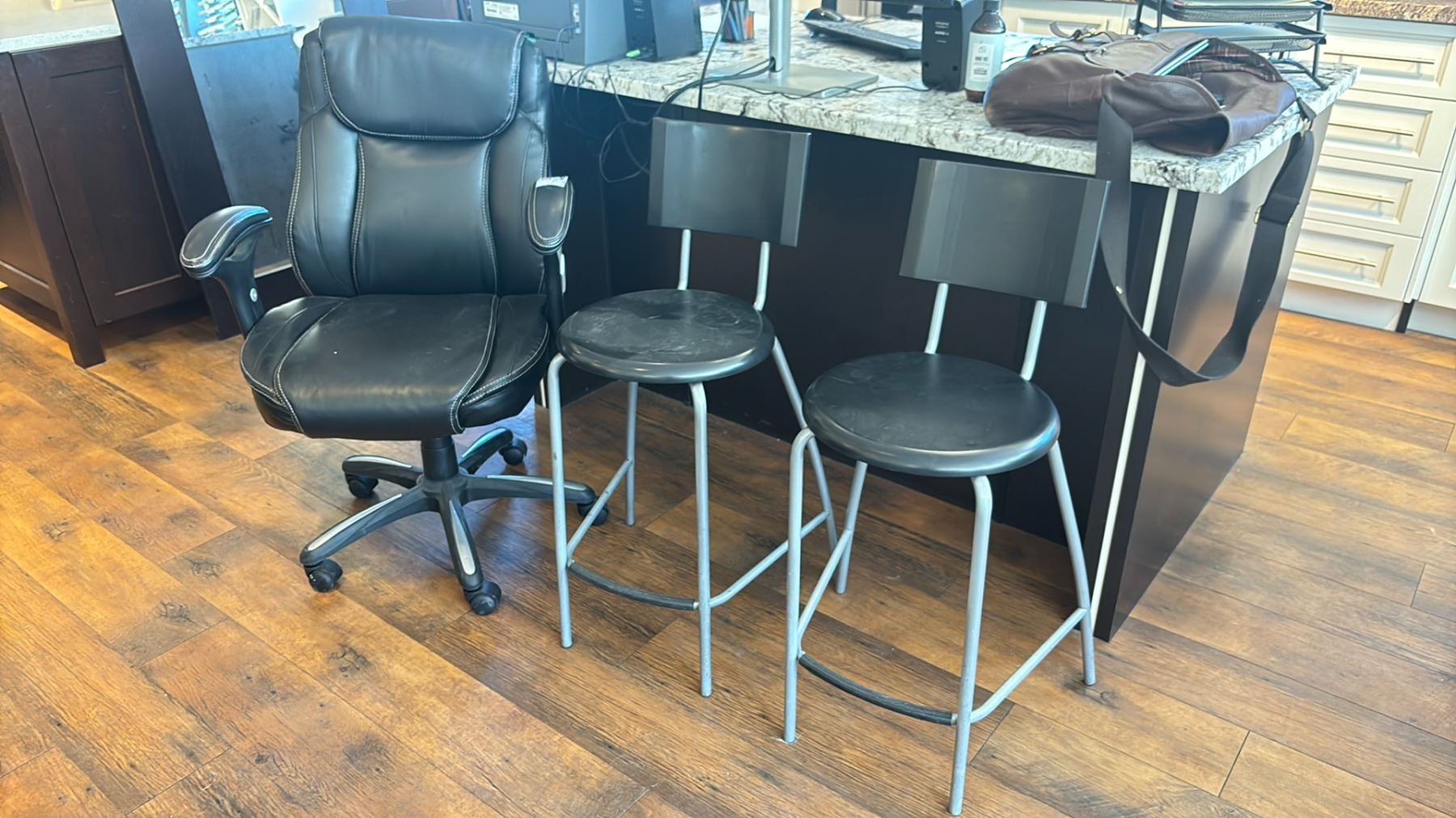 BLACK LEATHER HIGH BACK OFFICE CHAIR & A PAIR OF BLACK PLASTIC/METAL LEG BAR STOOLS