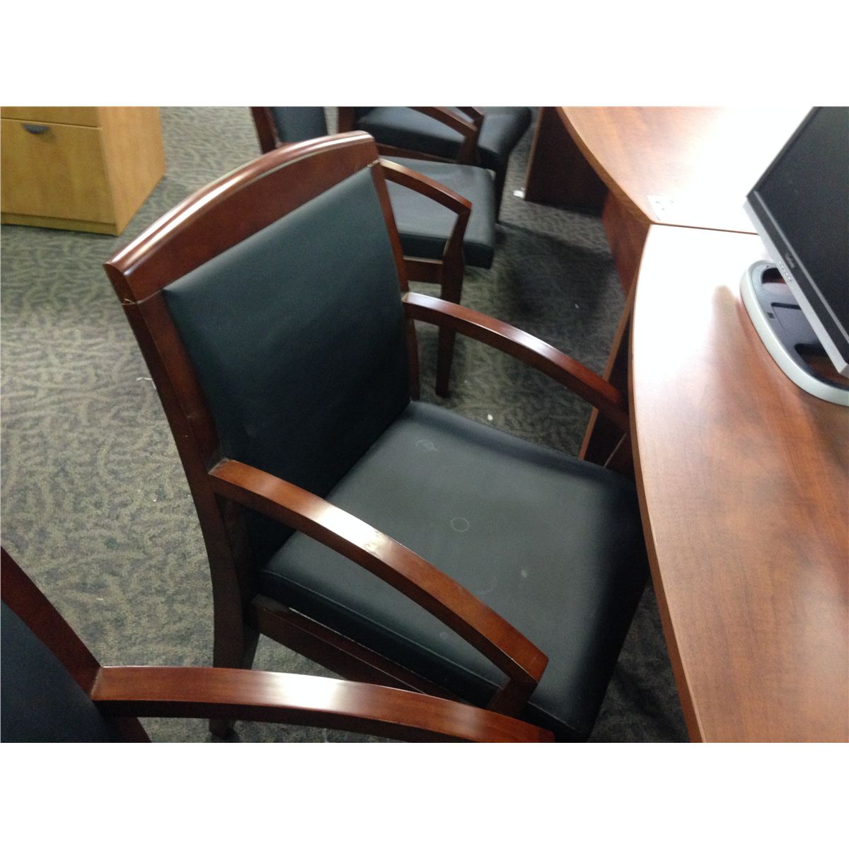 BLACK LEATHER MAHOGANY FRAME CLIENT CHAIR