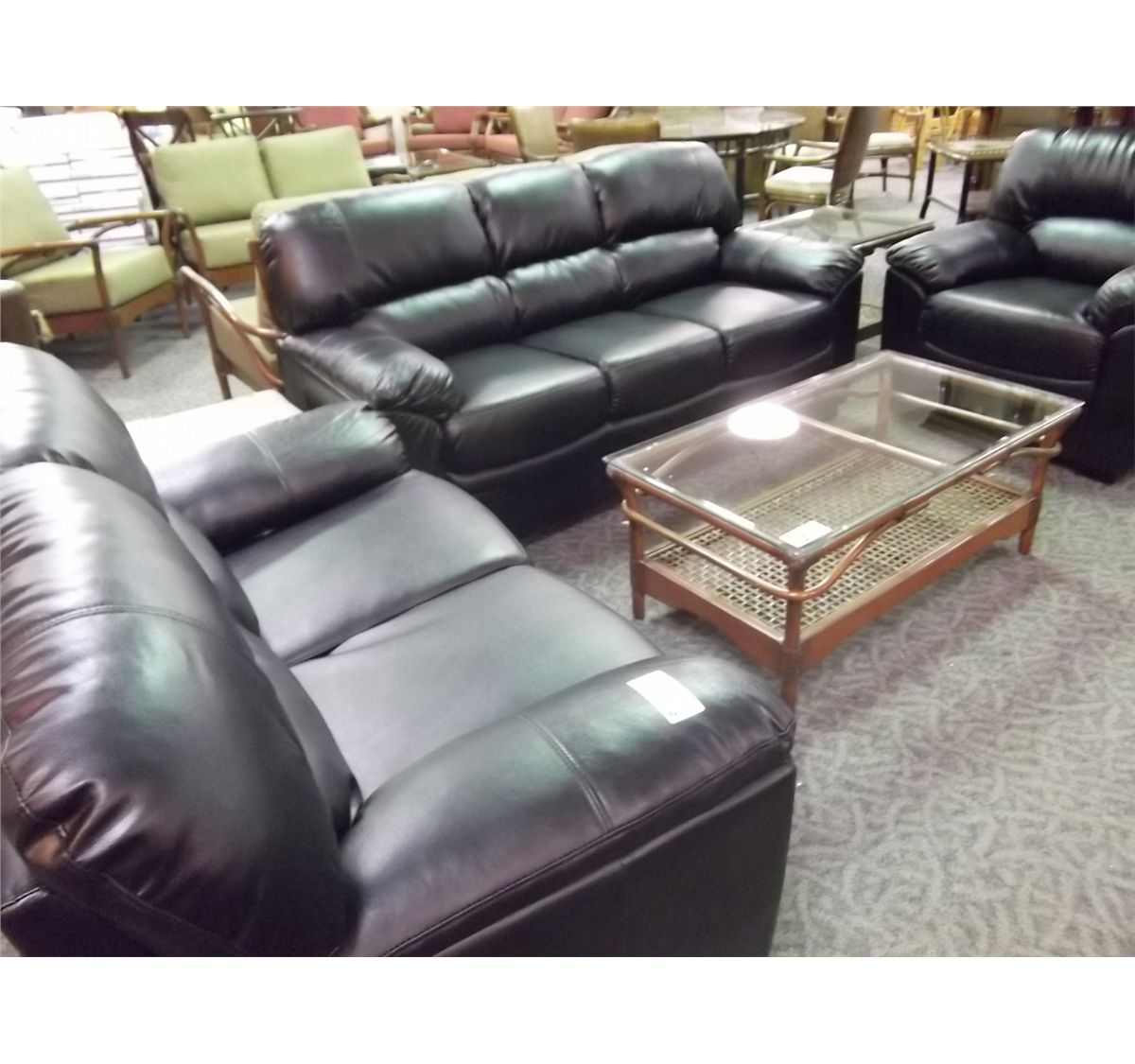 BLACK LEATHER OVER STUFFED 3 PIECE SOFA, LOVE SEAT & CHAIR SET
