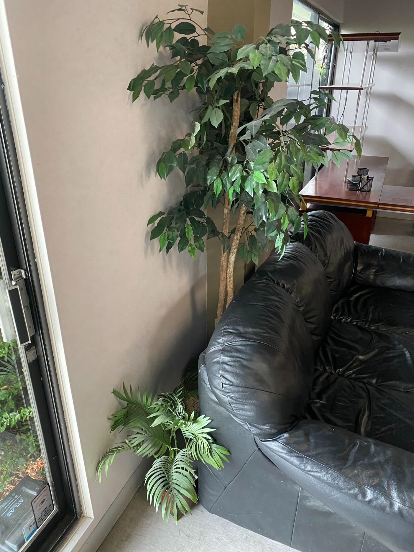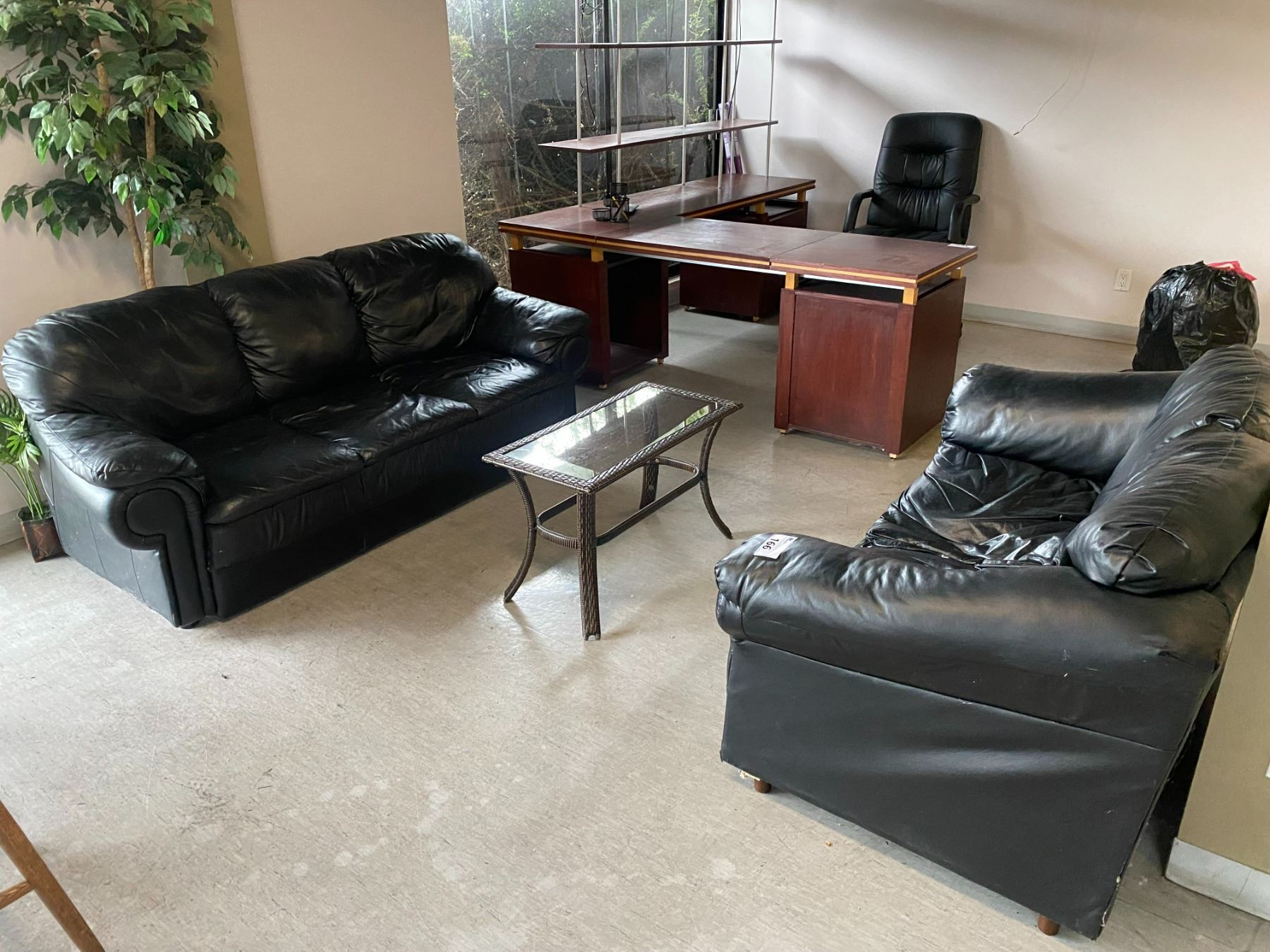 BLACK LEATHER STYLE LOVE SEAT, BLACK LEATHER STYLE 3 PERSON COUCH, GLASS COFFEE TABLE, 2 FAKE PLA...