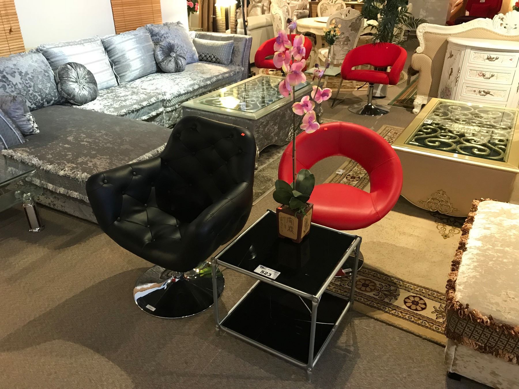 BLACK LEATHER SWIVEL CHAIR & RED LEATHER SWIVEL CHAIR WITH MODERN END TABLE & FLORAL DECOR