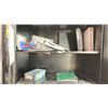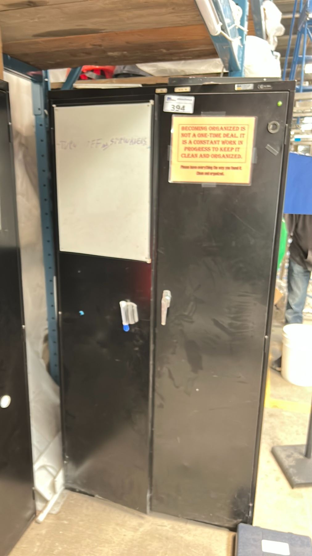 BLACK METAL 36" STORAGE CABINET WITH CONTENTS SNAP RINGS, O-RINGS, COTTER PINS, GROMMET KIT, C CLIPS, DIE GRINDER, THERMOMETER/TEMP GAUGE, GLUE GUN