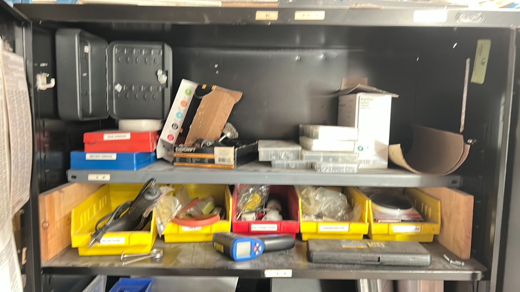 BLACK METAL 36" STORAGE CABINET WITH CONTENTS SNAP RINGS, O-RINGS, COTTER PINS, GROMMET KIT, C