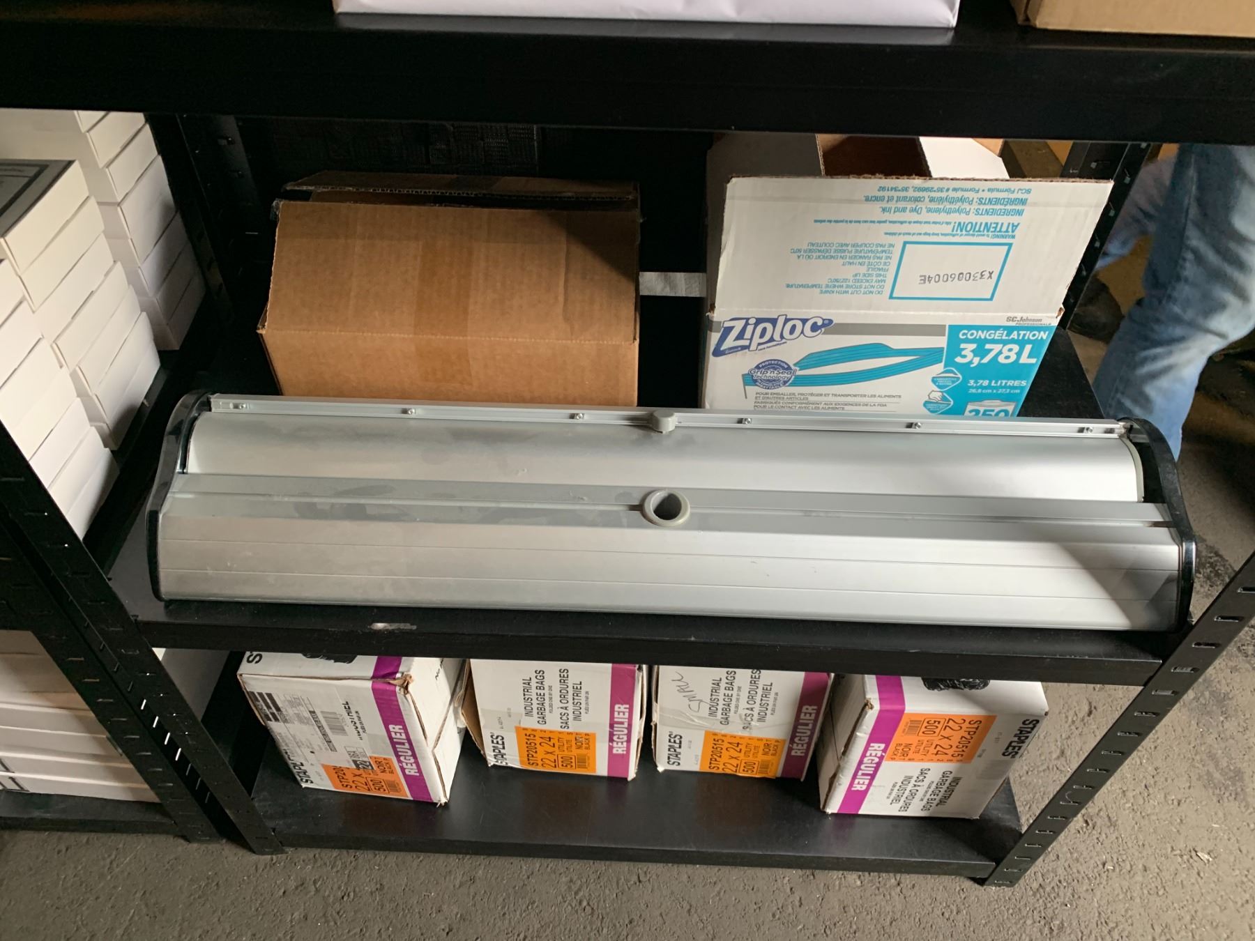 BLACK METAL LIGHT DUTY ADJUSTABLE SHELF OF ASSORTED COLOR LABELS, GARBAGE BAGS, 2 DYMO LABELERS, & OFFICE PRODUCTS