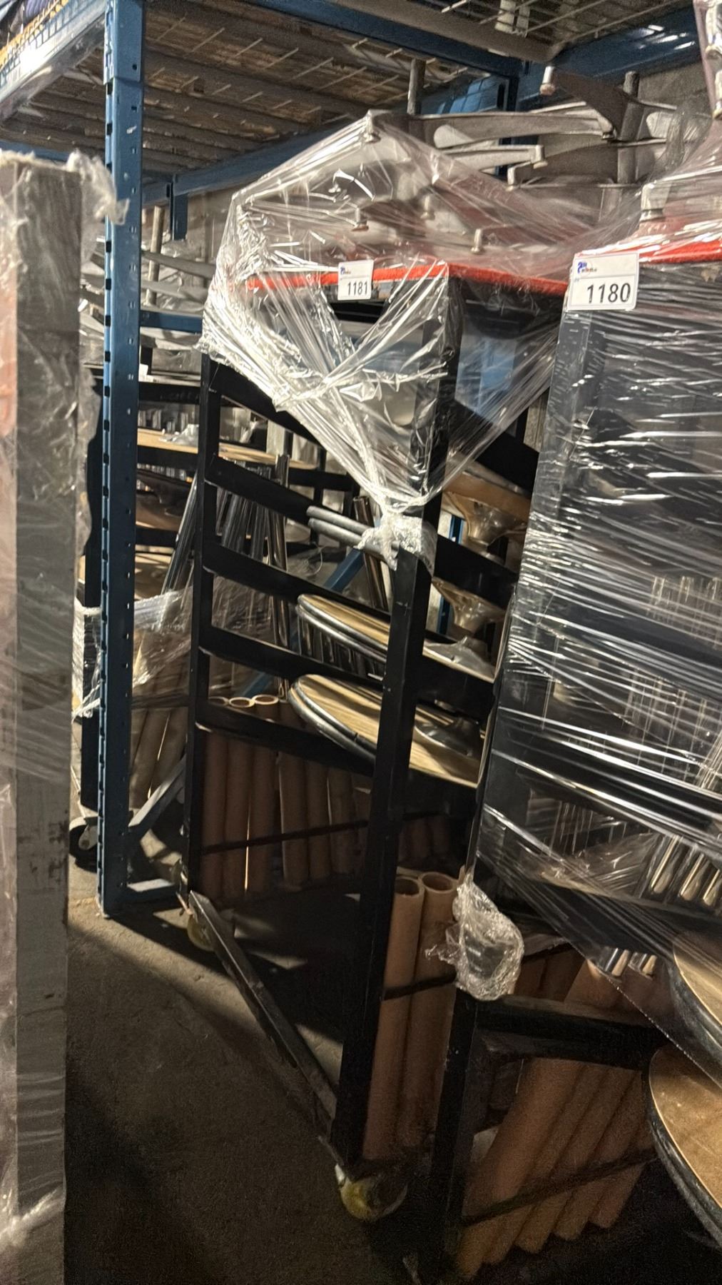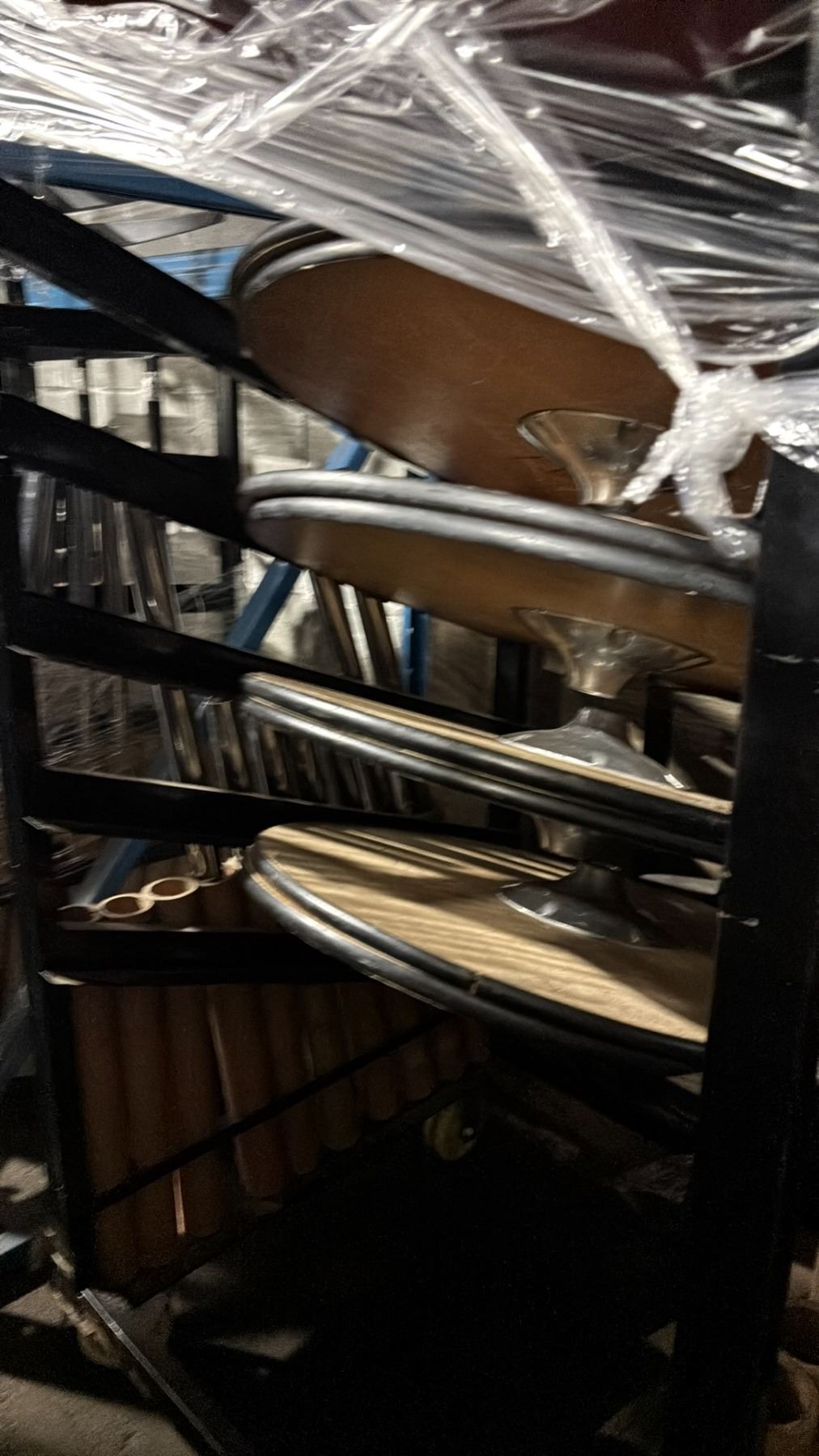 BLACK METAL MOBILE COCKTAIL TABLE EVENT CART WITH ASSORTED WOODEN 3 PCS COCKTAIL TABLES / STANDS / BASES *MOBILE CART INCLUDED*