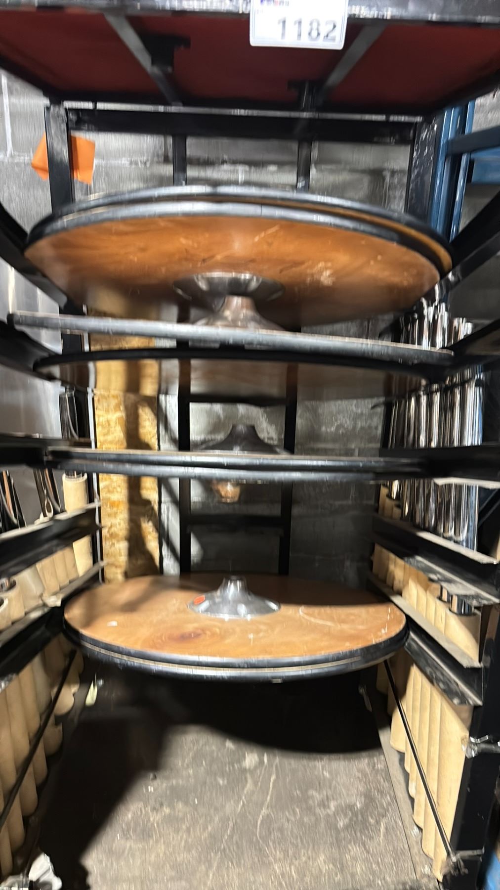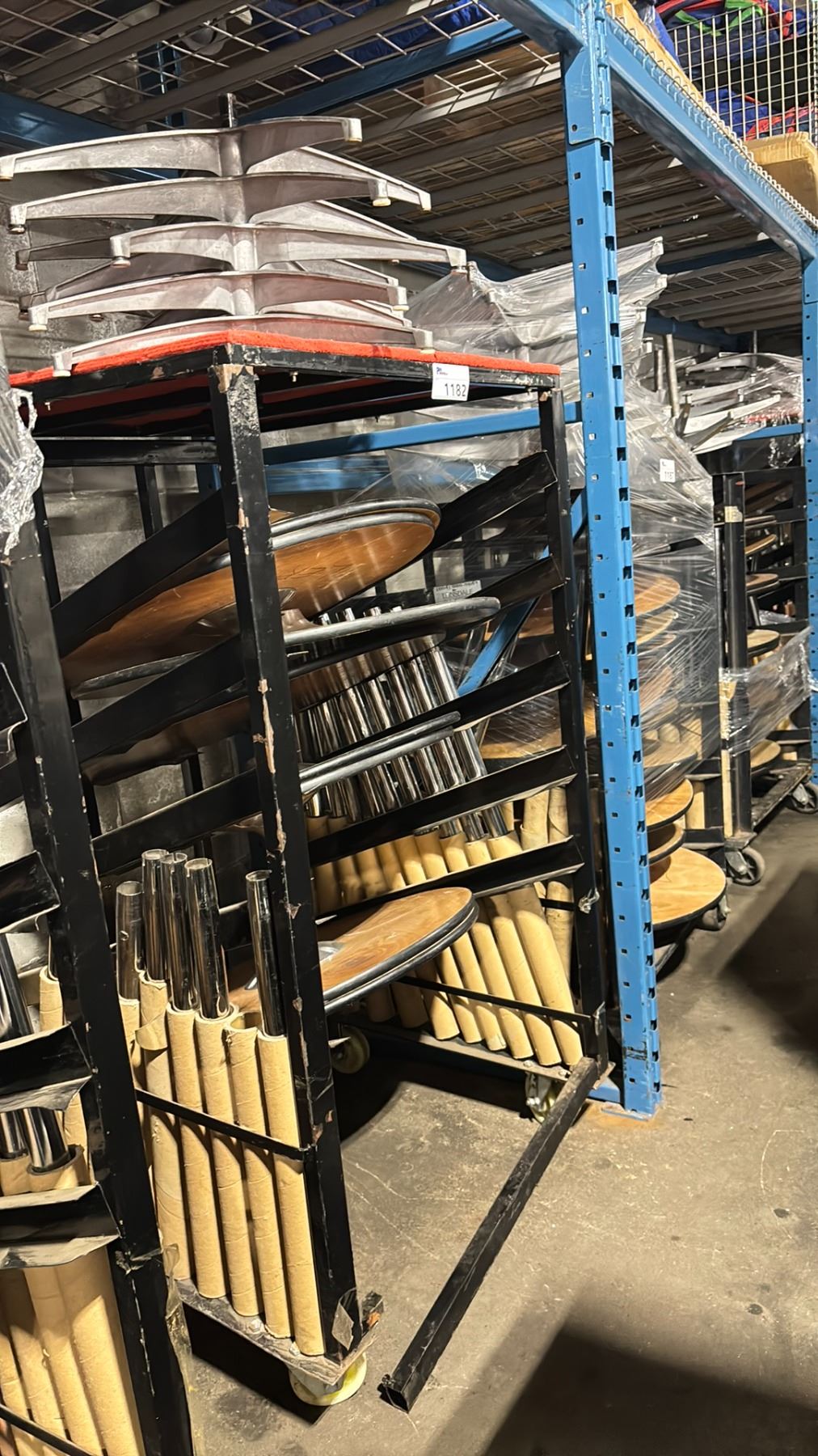 BLACK METAL MOBILE COCKTAIL TABLE EVENT CART WITH ASSORTED WOODEN 3 PCS COCKTAIL TABLES / STANDS / BASES *MOBILE CART INCLUDED*