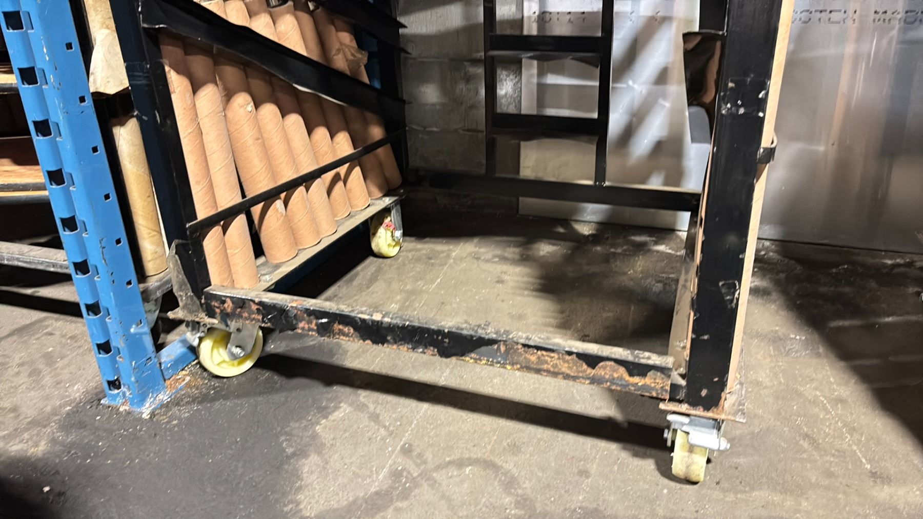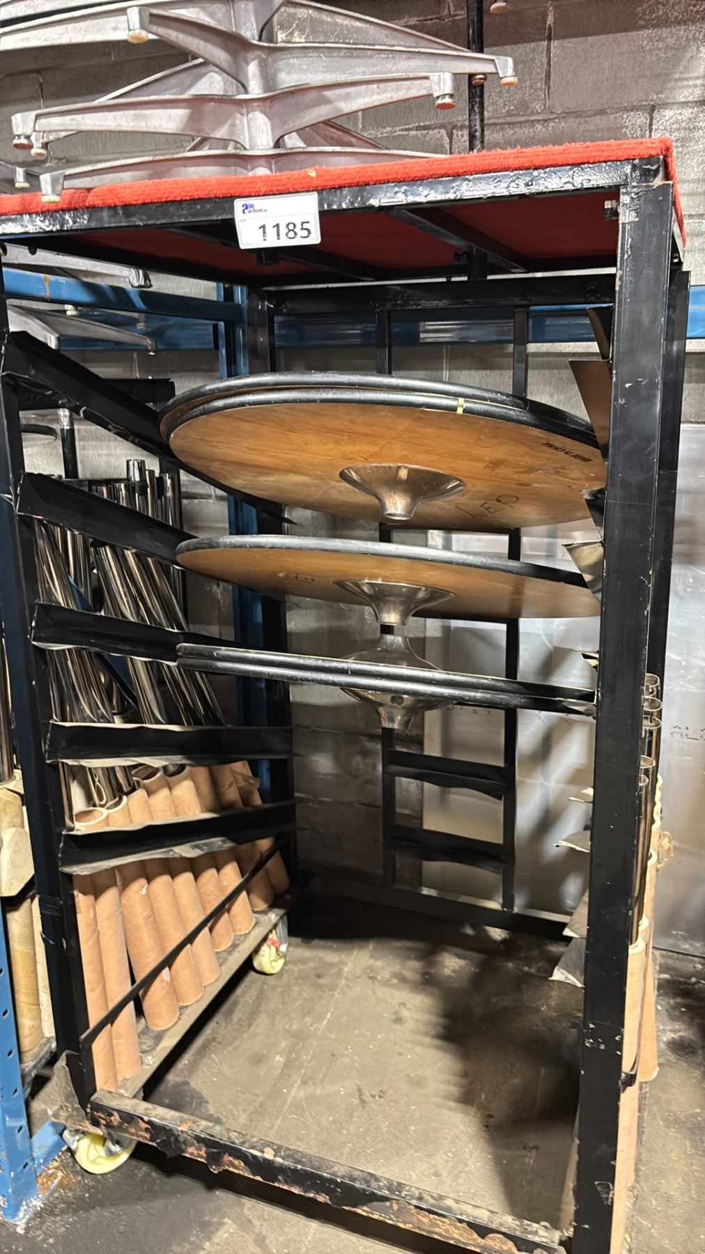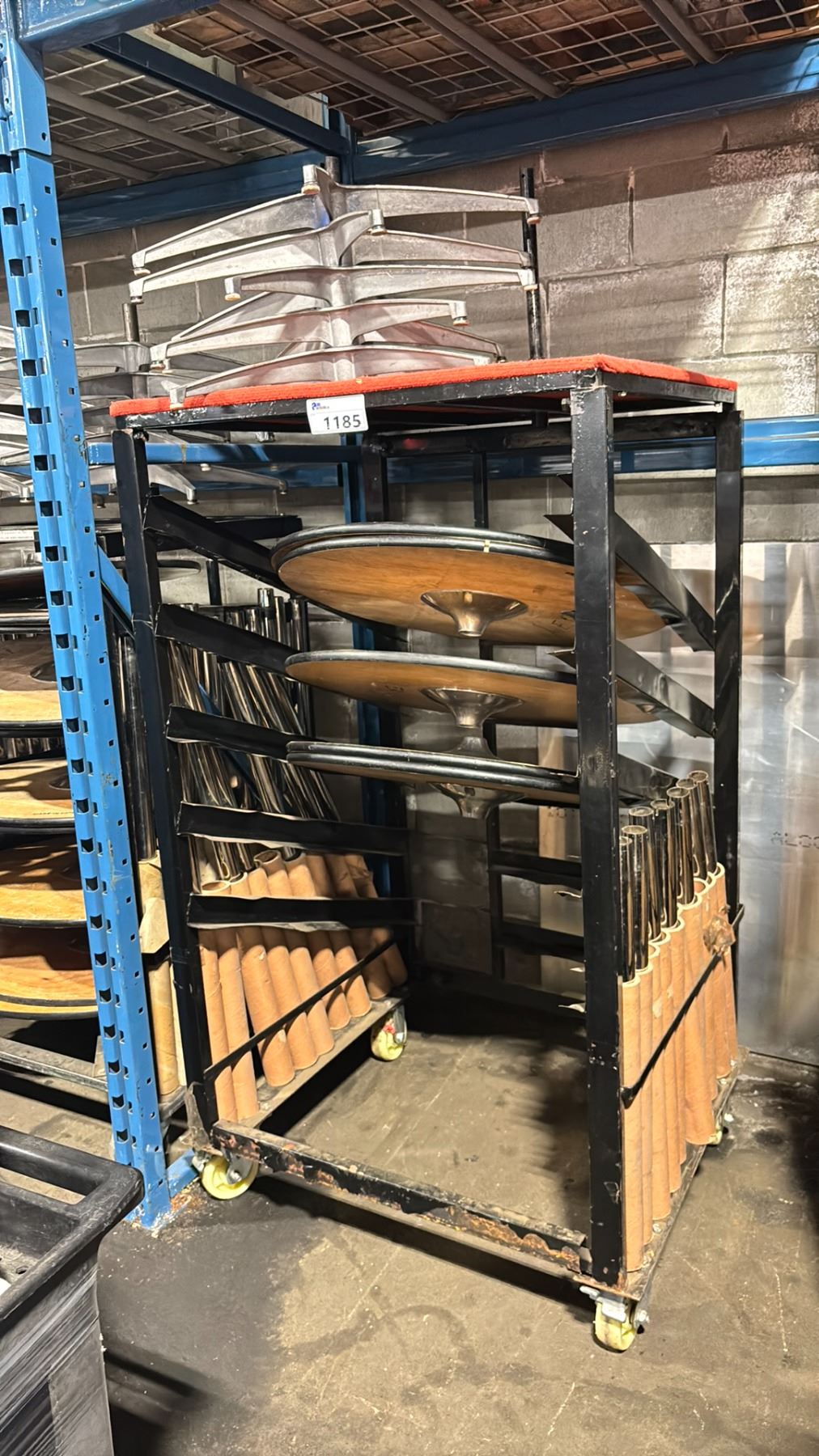 BLACK METAL MOBILE COCKTAIL TABLE EVENT CART WITH ASSORTED WOODEN 3 PCS COCKTAIL TABLES / STANDS / BASES *MOBILE CART INCLUDED*