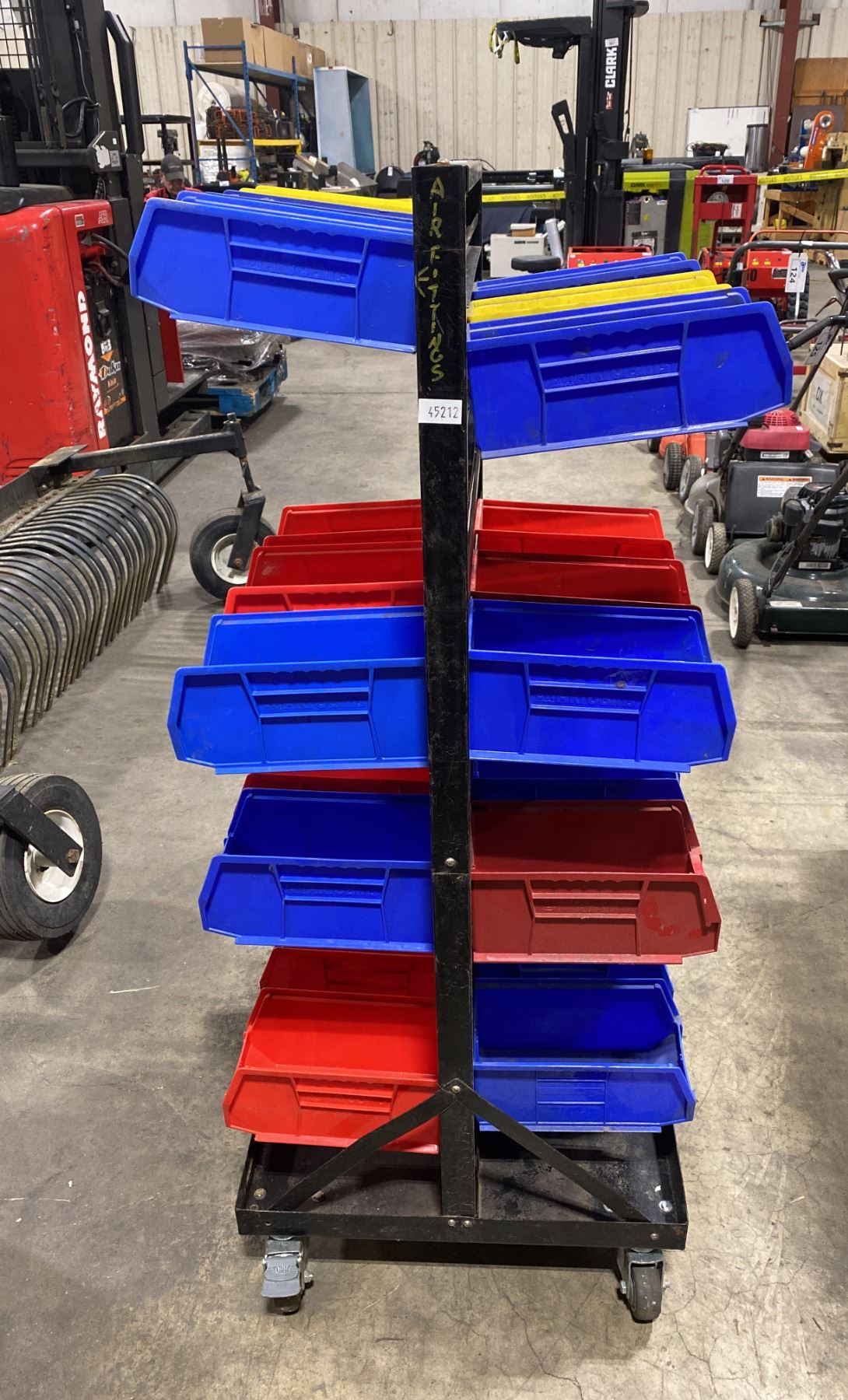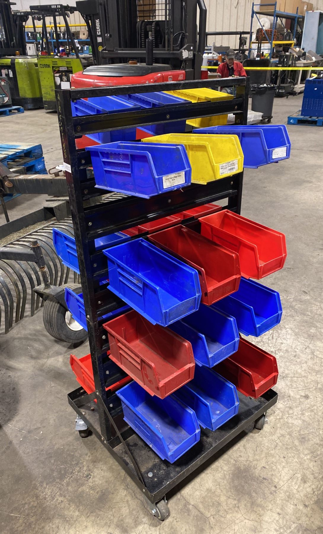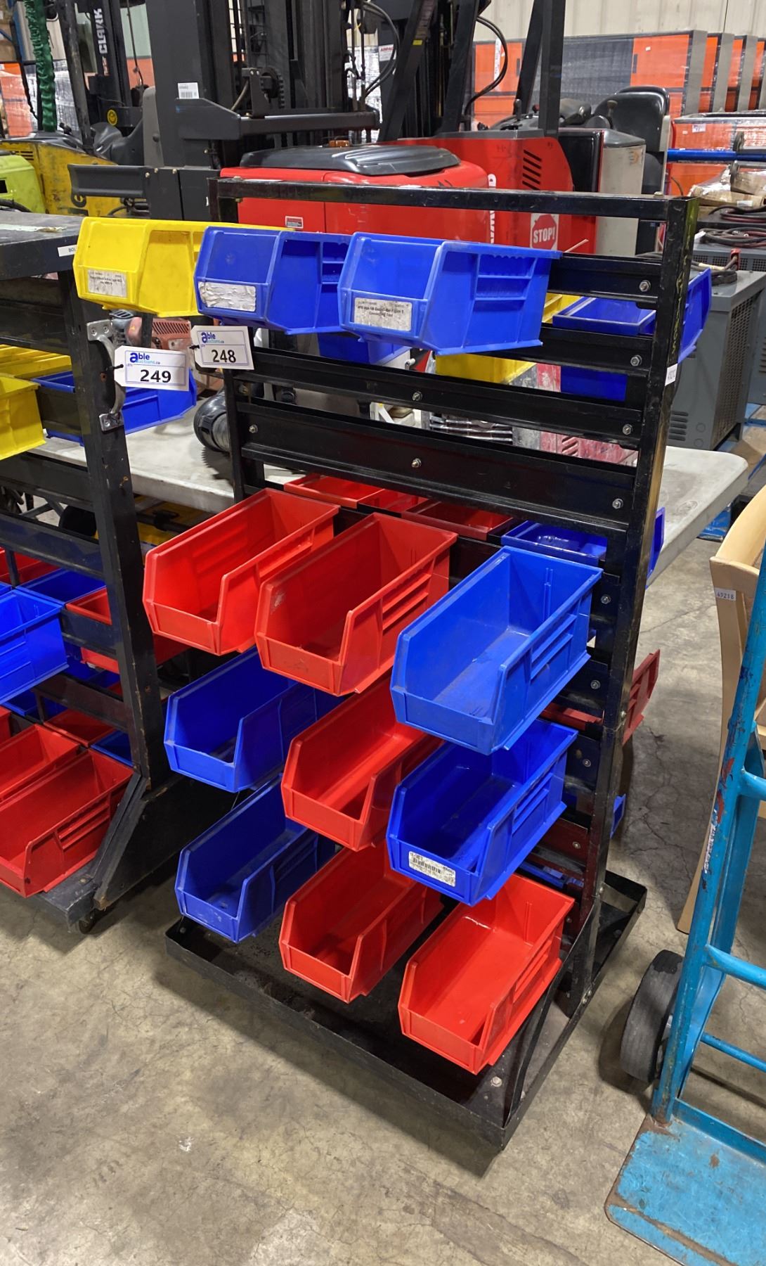 BLACK METAL MOBILE INDUSTRIAL PARTS RACK WITH ASSORTED PLASTIC PART BINS