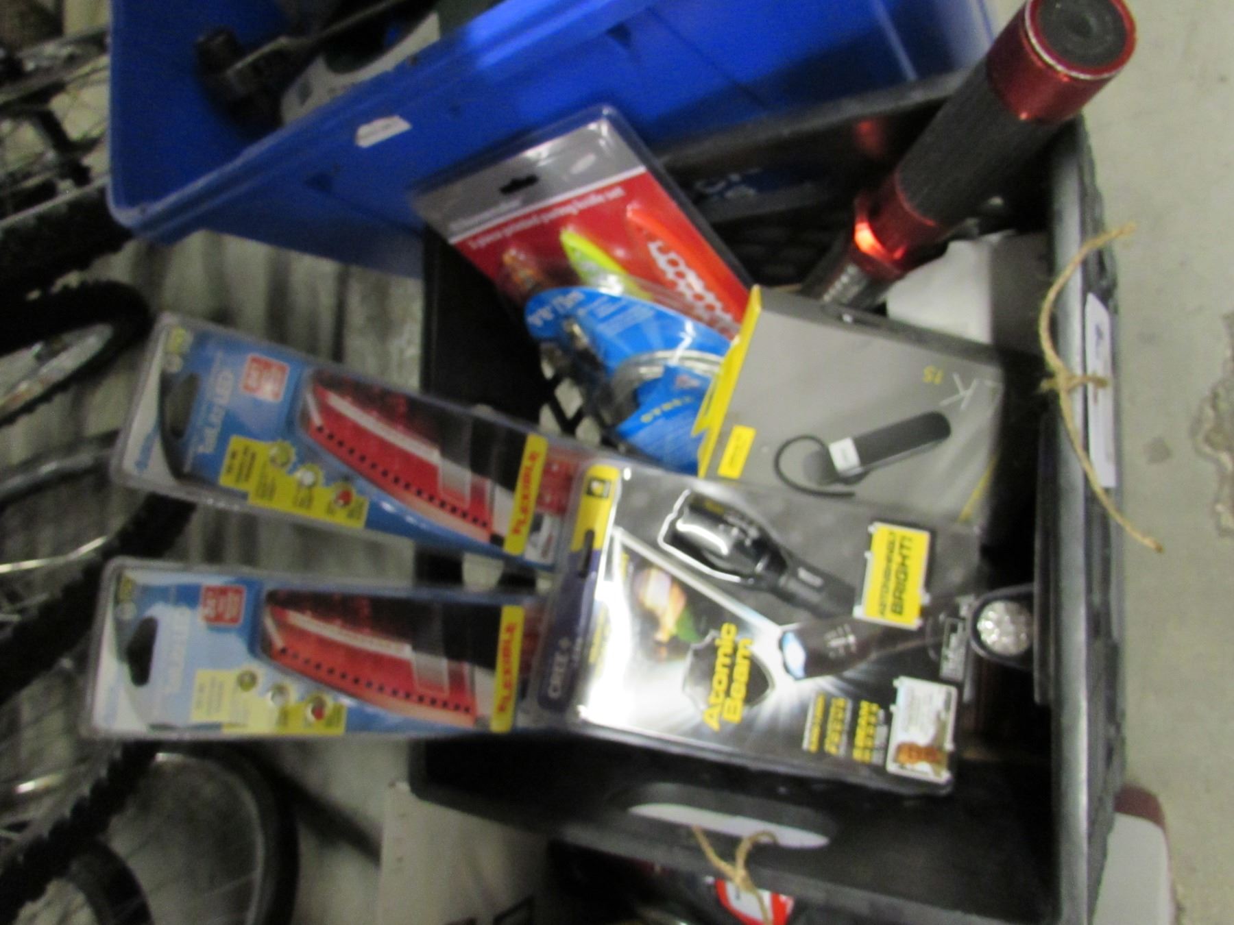 BLACK MILK CRATE OF ASSORTED CONTENTS (TAIL LITZ 24" LED AUTOMOTIVE LIGHTS, LED FLASHLIGHT, MAGLIGHT, ATOMIC BEAM TACTICAL FLASHLIGHTS, JABRA BLUETOOTH HEADSET, TAPE MEASURE, BLUETOOTH MUSIC RECEIVER, ETC)