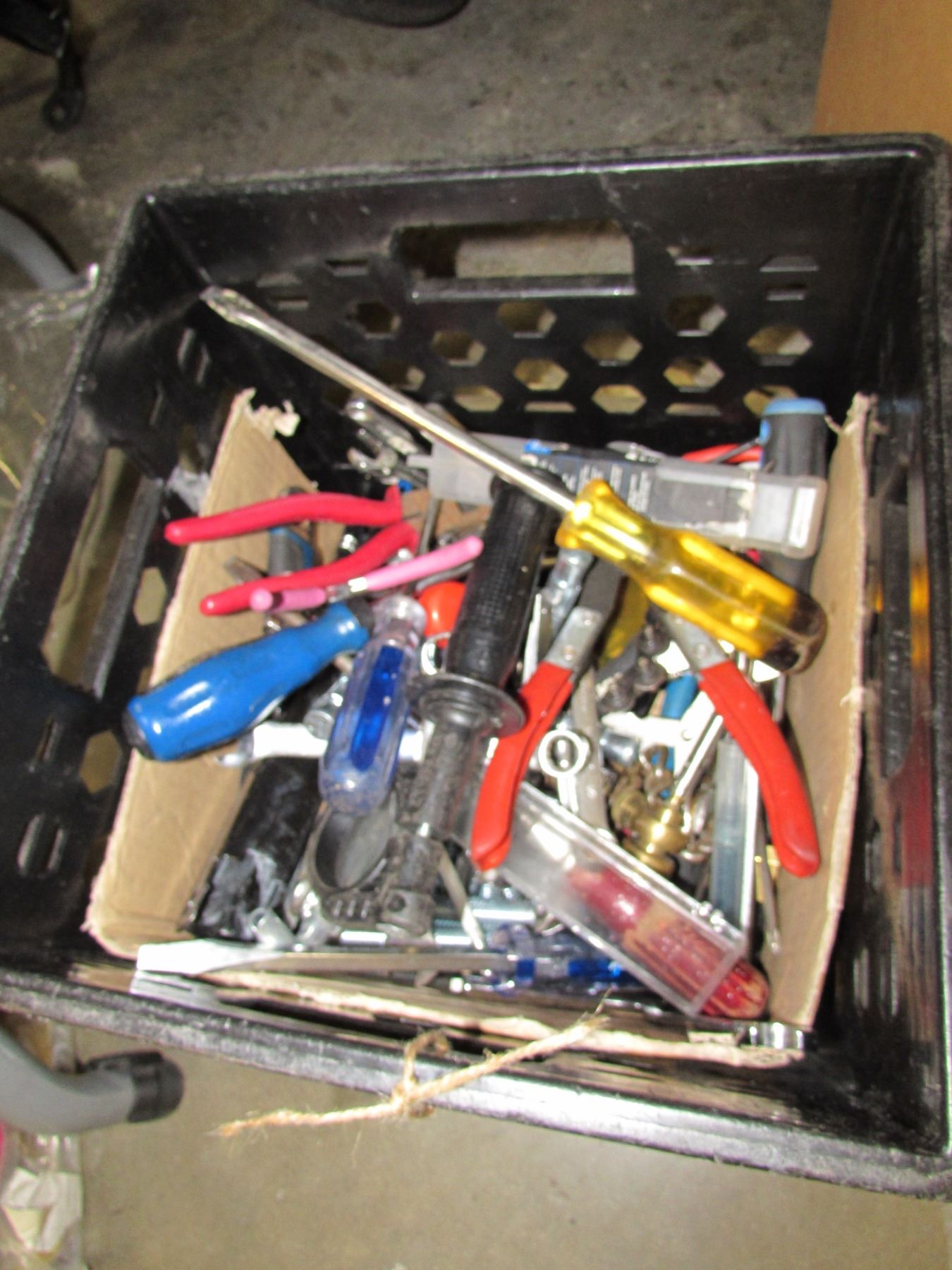 BLACK MILK CRATE OF ASSORTED HAND TOOLS (SCREWDRIVERS, PLYERS, WRENCHES, ETC)