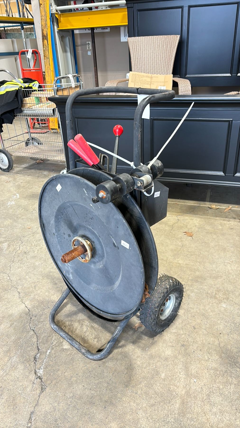 BLACK MOBILE INDUSTRIAL BAND STRAPPING CART WITH SOME BANDING STRAP & TOOLING