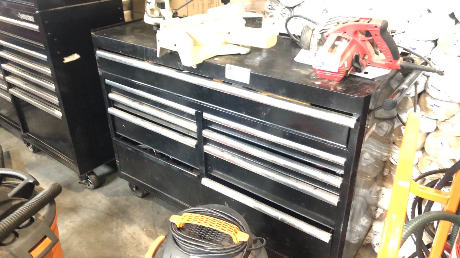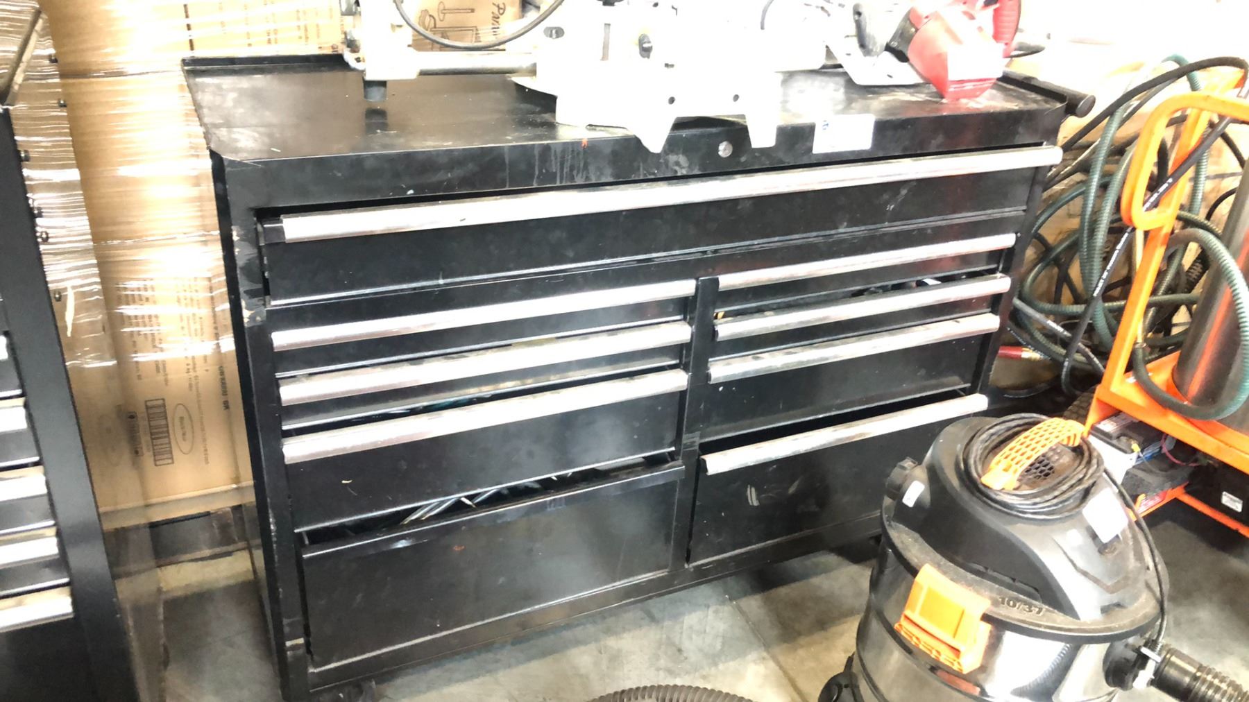 BLACK MULTI-DRAWER TROLLEY TOOL CABINET W/ CONTENTS D18" X W54" X H38" - NO KEY