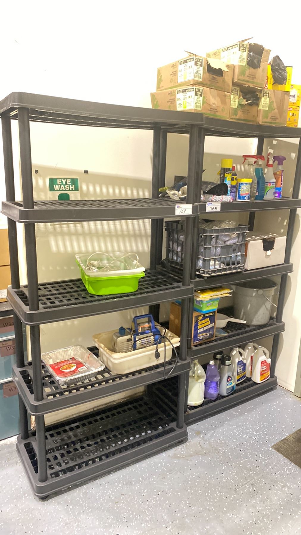 BLACK PLASTIC 5 TIER STORAGE SHELVES WITH CONTENTS - INCLUDING GARBAGE BAGS, ASSORTED CLEANERS, MOP HEADS, BUCKET & SWEEPING COMPOUND