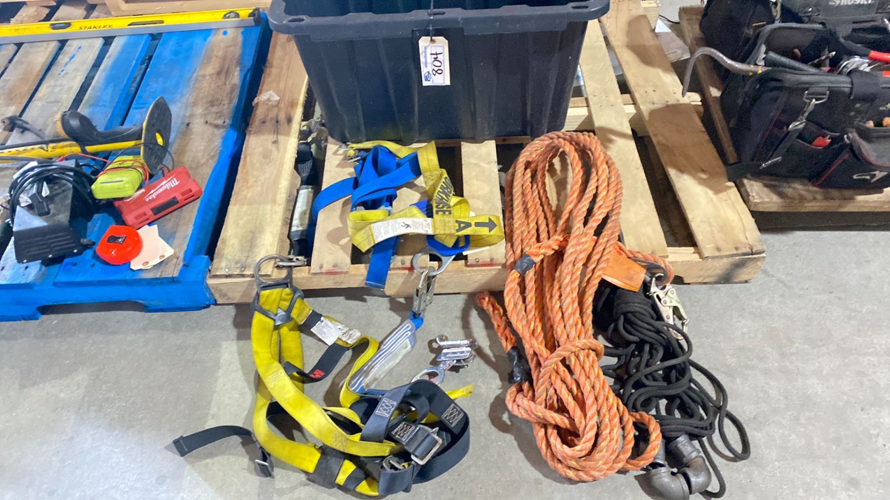 BLACK PLASTIC BIN WITH TWO SAFETY HARNESSES, SHOCK ABSORBING LANYARDS AND ONE SAFETY ROPE 50'