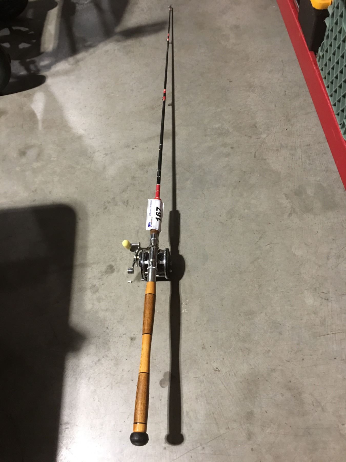 BLACK & RED FISHING ROD WITH PENN LONGBEACH LEVEL WIND FISHING REEL