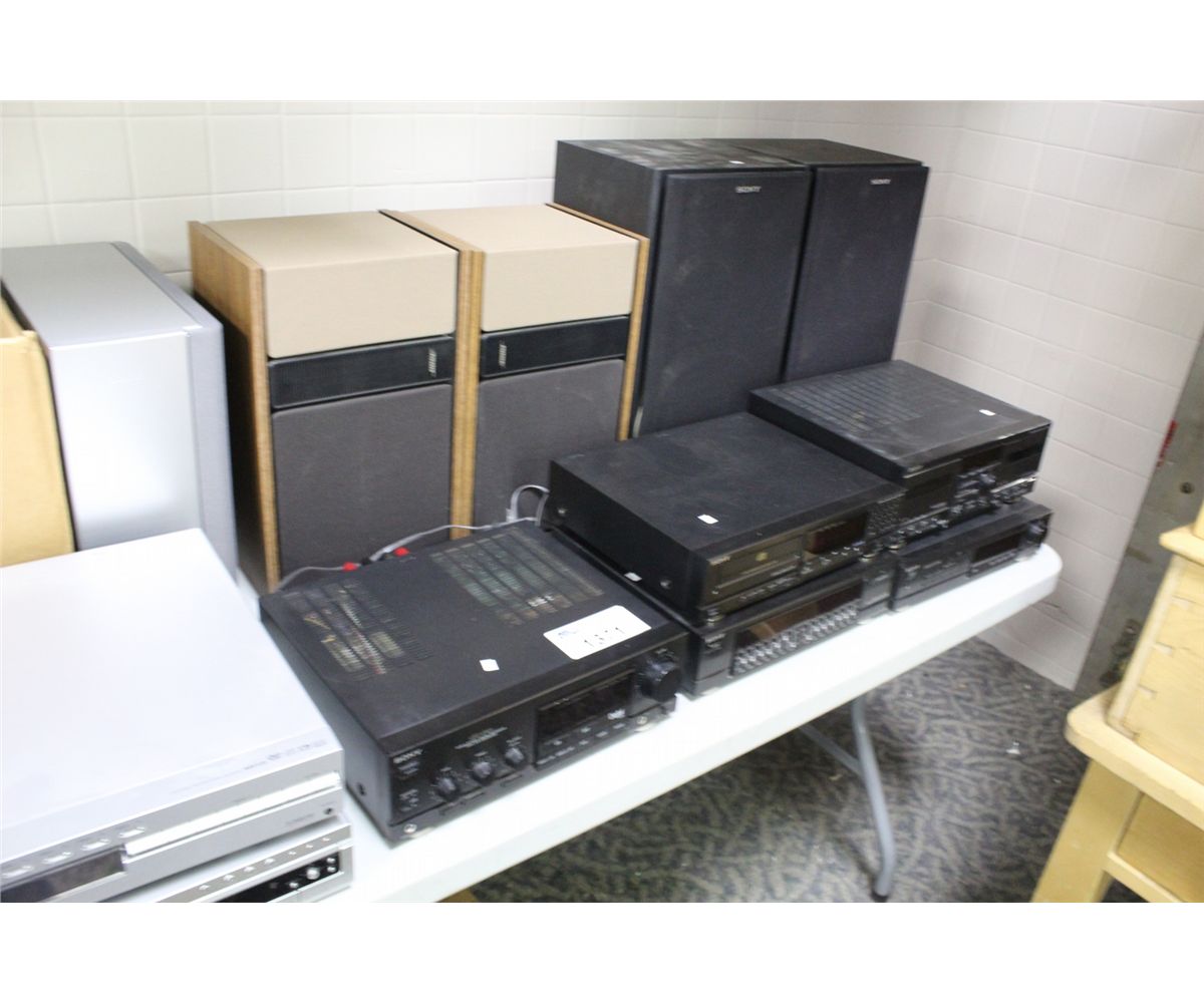 BLACK SONY SOUND SYSTEM , WITH RECEIVER, EQUALIZER, CD PLAYER AND TAPE DECK, AND 4 SPEAKERS