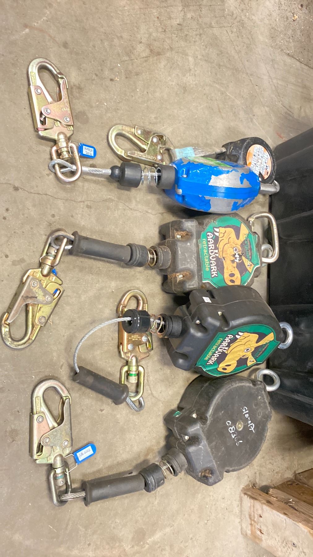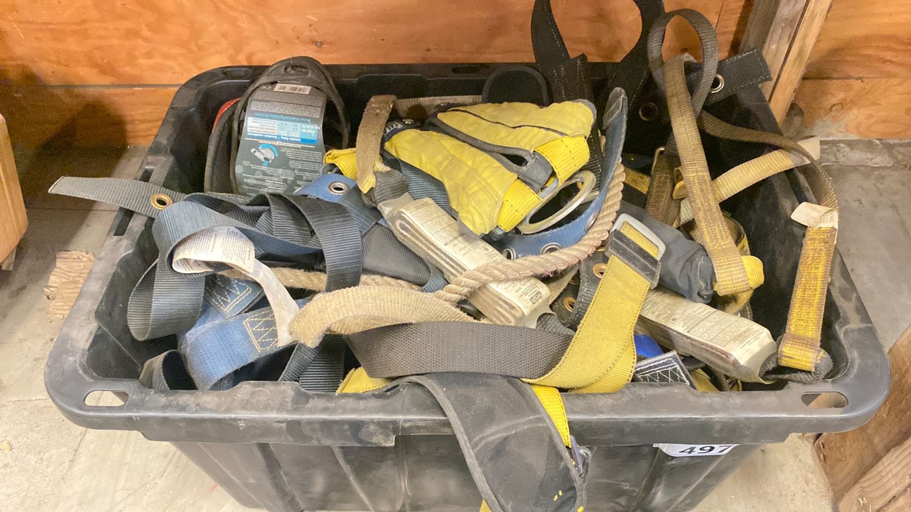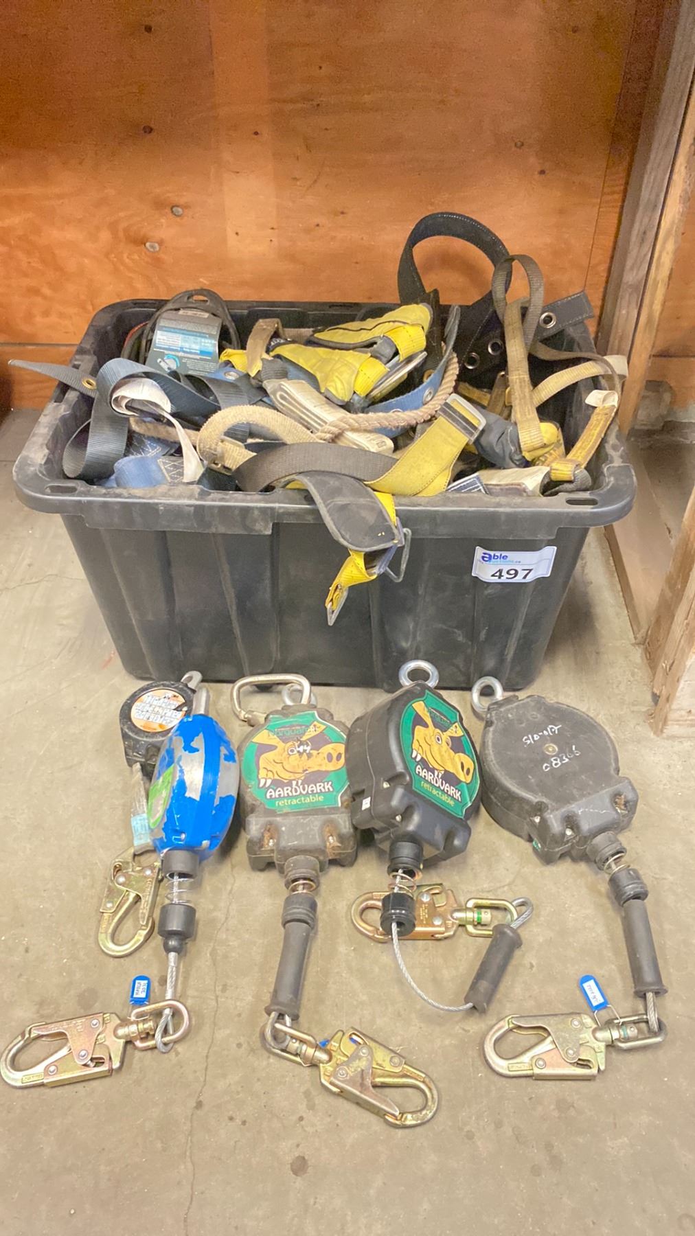 BLACK STORAGE TOTE OF RETRACTABLE FALL PROTECTION LINES & HARNESSES
