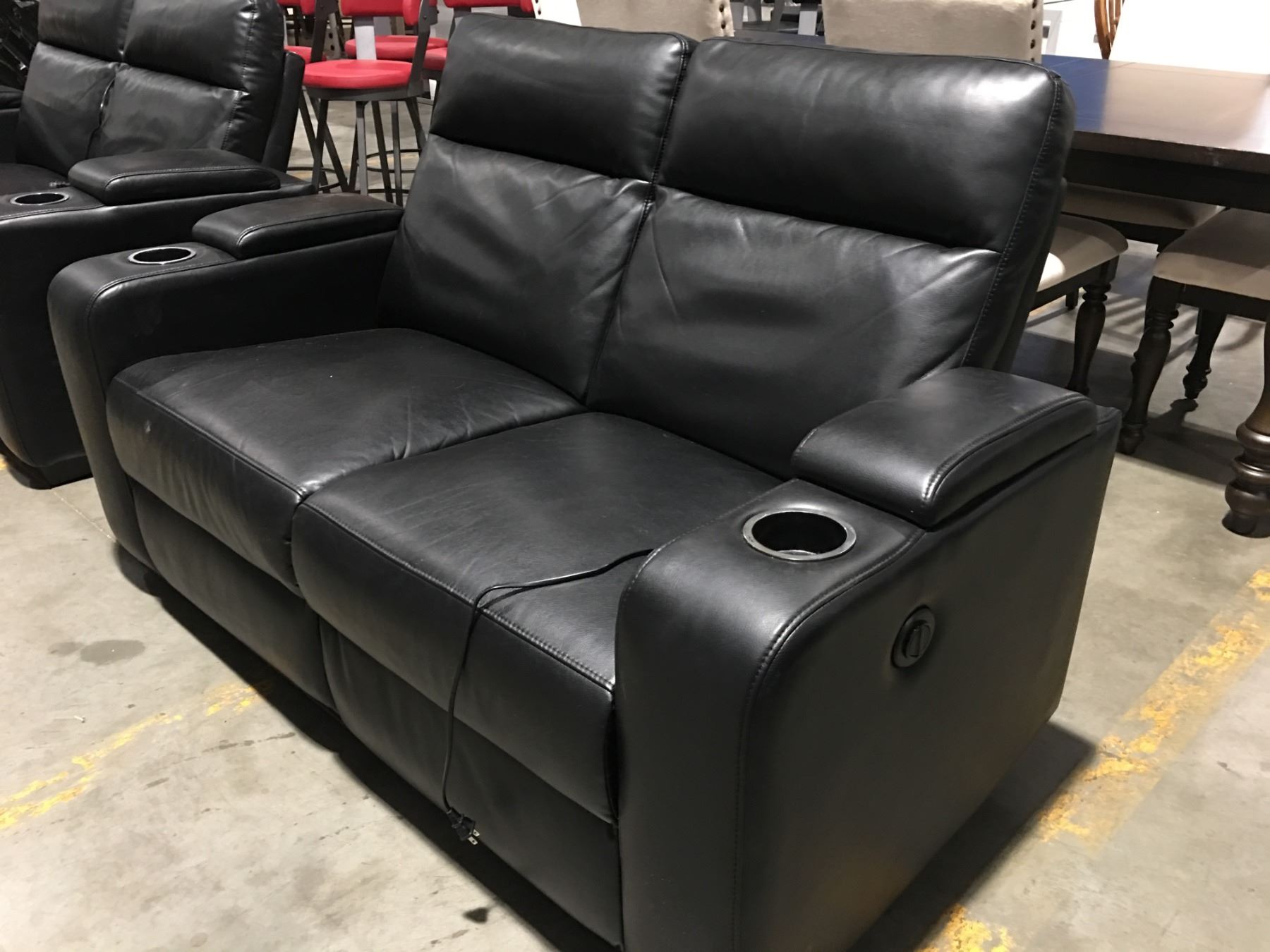 BLACK UPHOLSTERED 2-SEAT THEATRE SOFA WITH ELECTRIC RECLINERS (RECLINER REQUIRES REPAIR)