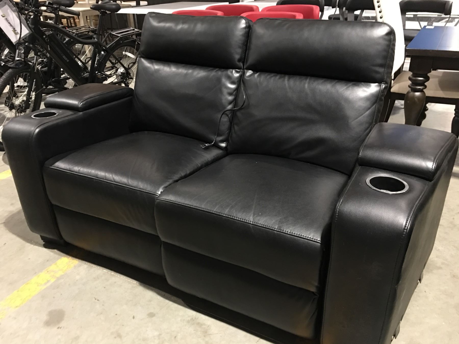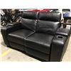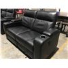 BLACK UPHOLSTERED 2-SEAT THEATRE SOFA WITH ELECTRIC RECLINERS (RECLINER REQUIRES REPAIR)