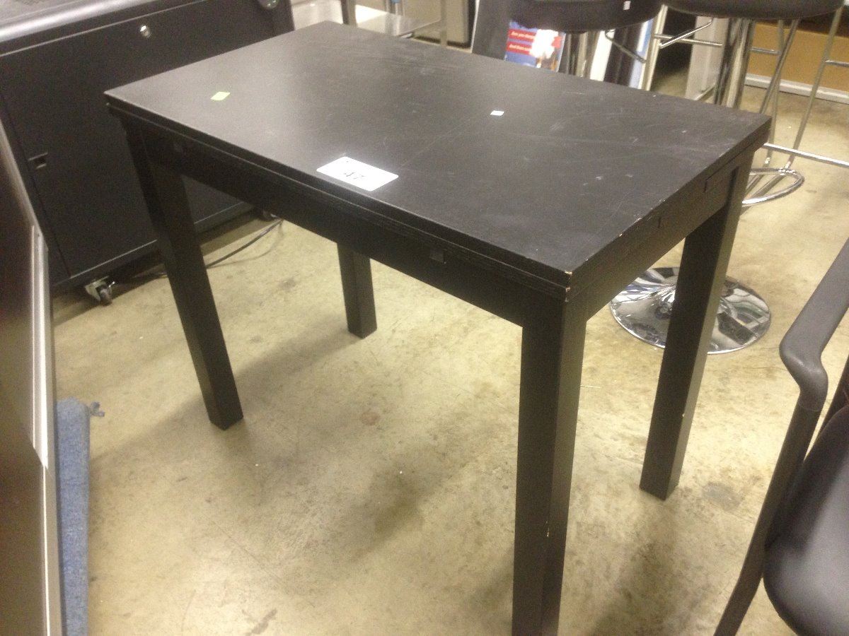 BLACK WOOD TABLE WITH LEAVES, AND 9 GREY STACKING CHAIRS