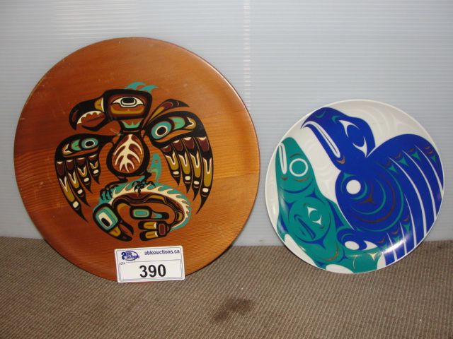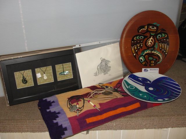 BLANKET, BOLO TIES, ARTWORK, AND NATIVE WOODEN AND PORCELAIN PLATE