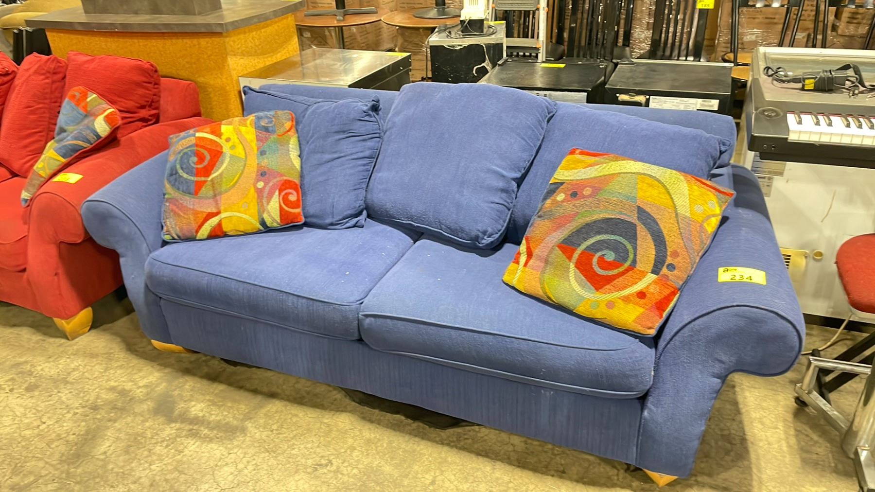 BLUE 2 SEAT FABRIC SOFA WITH CUSHIONS & 2 PATTERNED THROW PILLOWS