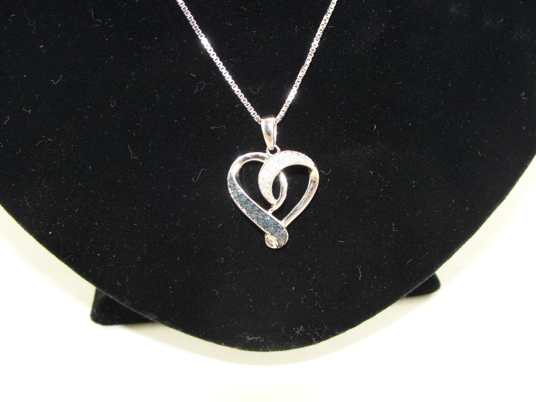 BLUE AND WHITE DIAMOND STUDDED HEART NECKLACE - 21 WHITE AND 22 BLUE DIAMONDS, STERLING SILVER