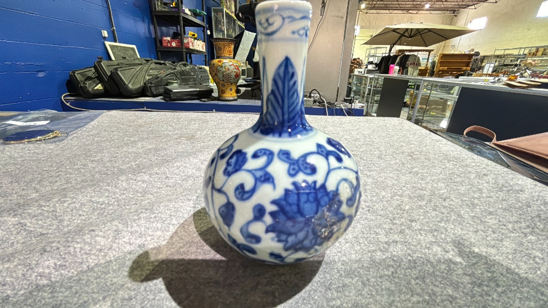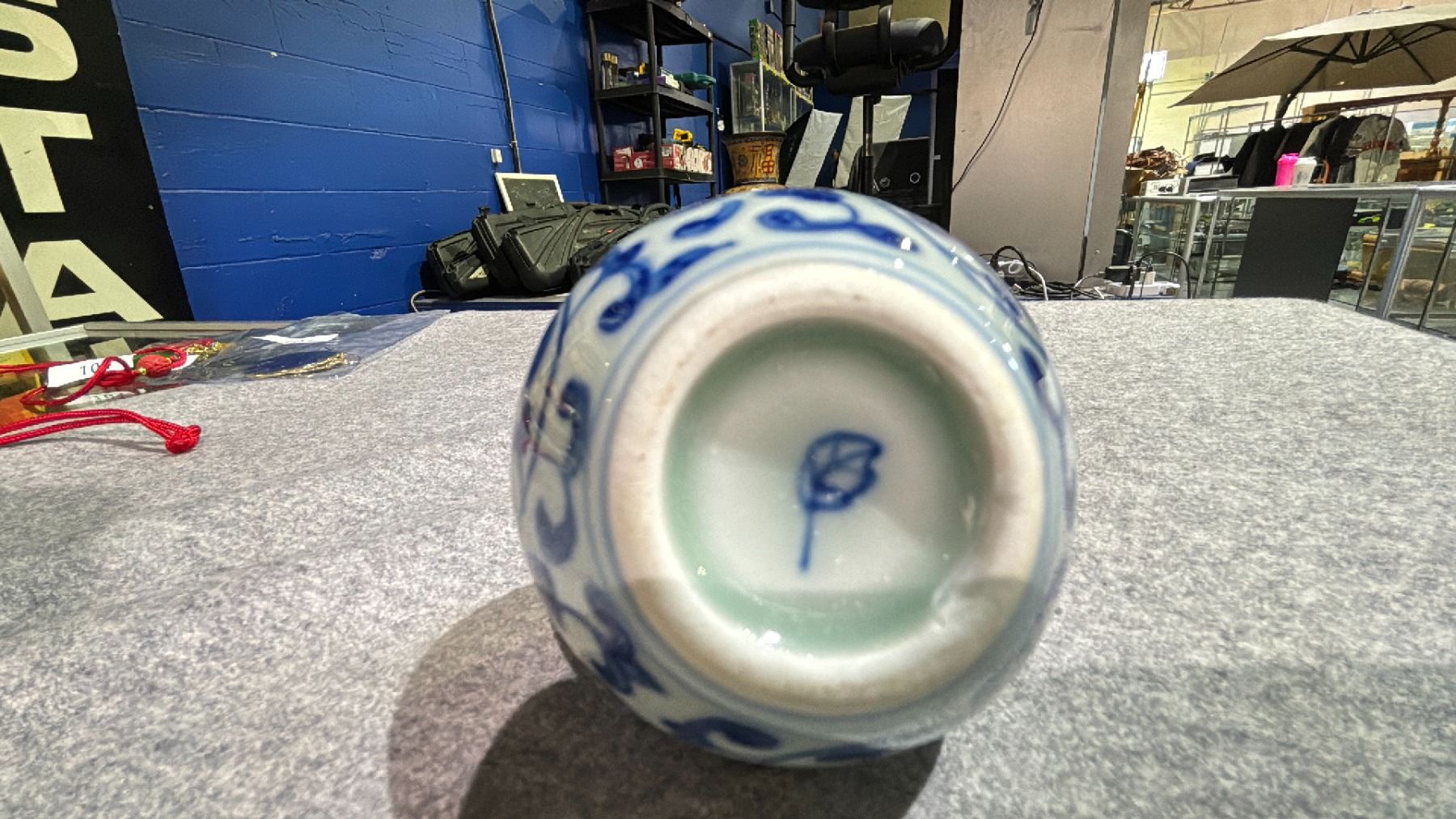 BLUE AND WHITE LOTUS BRANCH VASE APPROX 4" HIGH