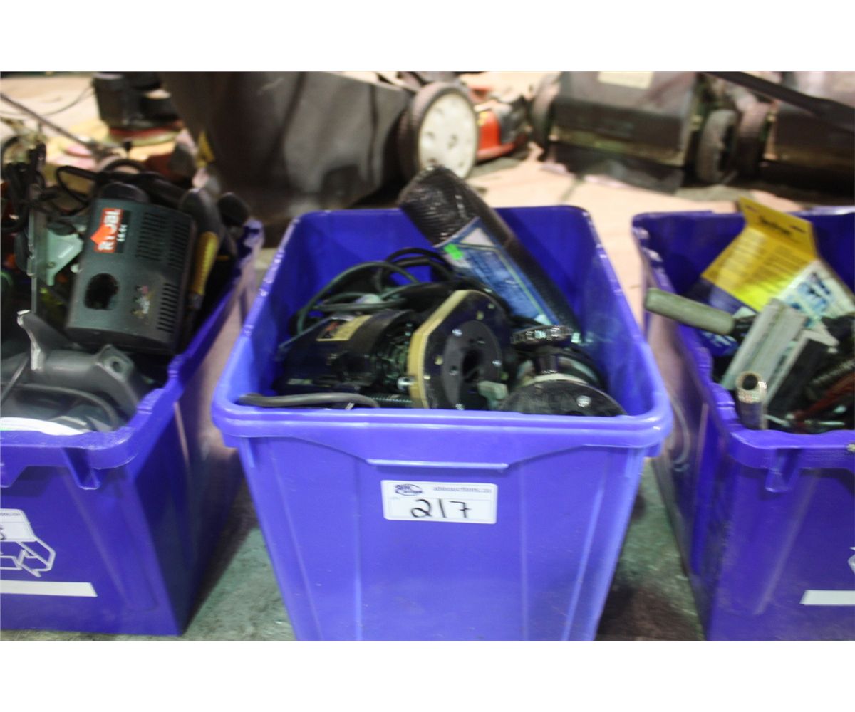 BLUE BIN OF ASSORTED TOOLS & POWER TOOLS