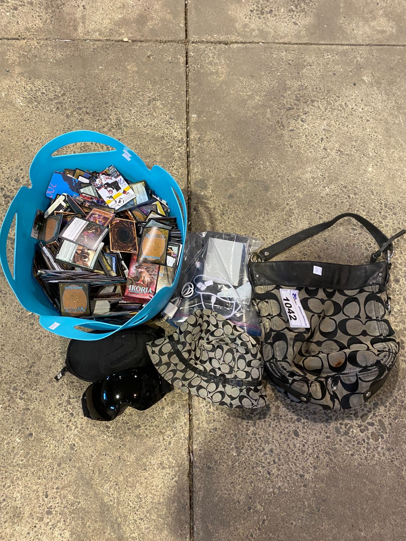 BLUE BUCKET OF ASSORTED MAGIC THE GATHERING CARDS, PURSE, EREADER, SKI/SNOWBOARD GOGGLES, & MORE