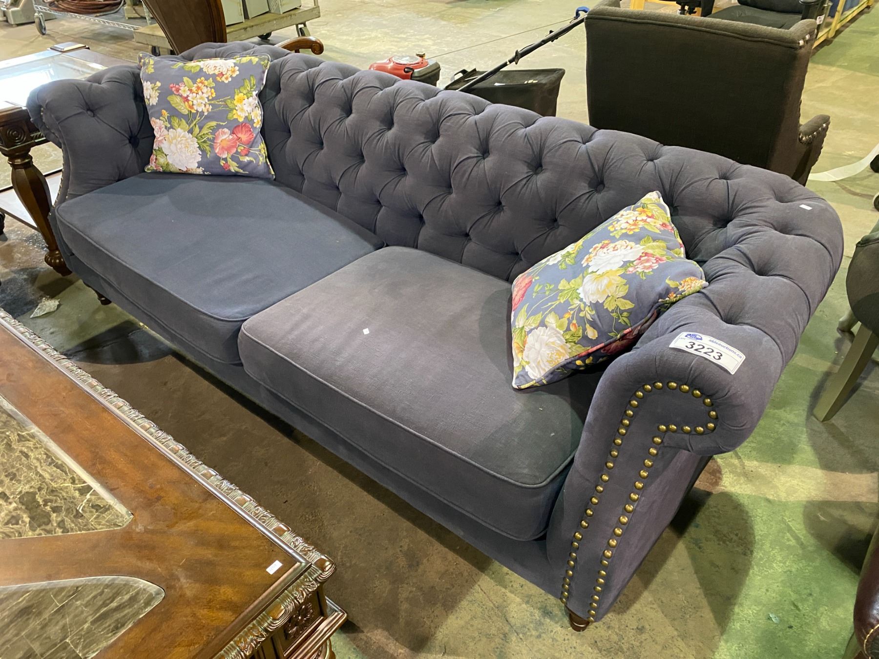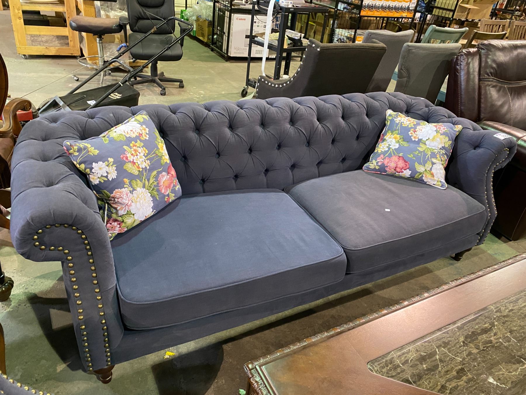 BLUE BUTTON BACK SOFA WITH 2 THROW FLORAL PRINT PILLOWS APPROX. 86" LONG