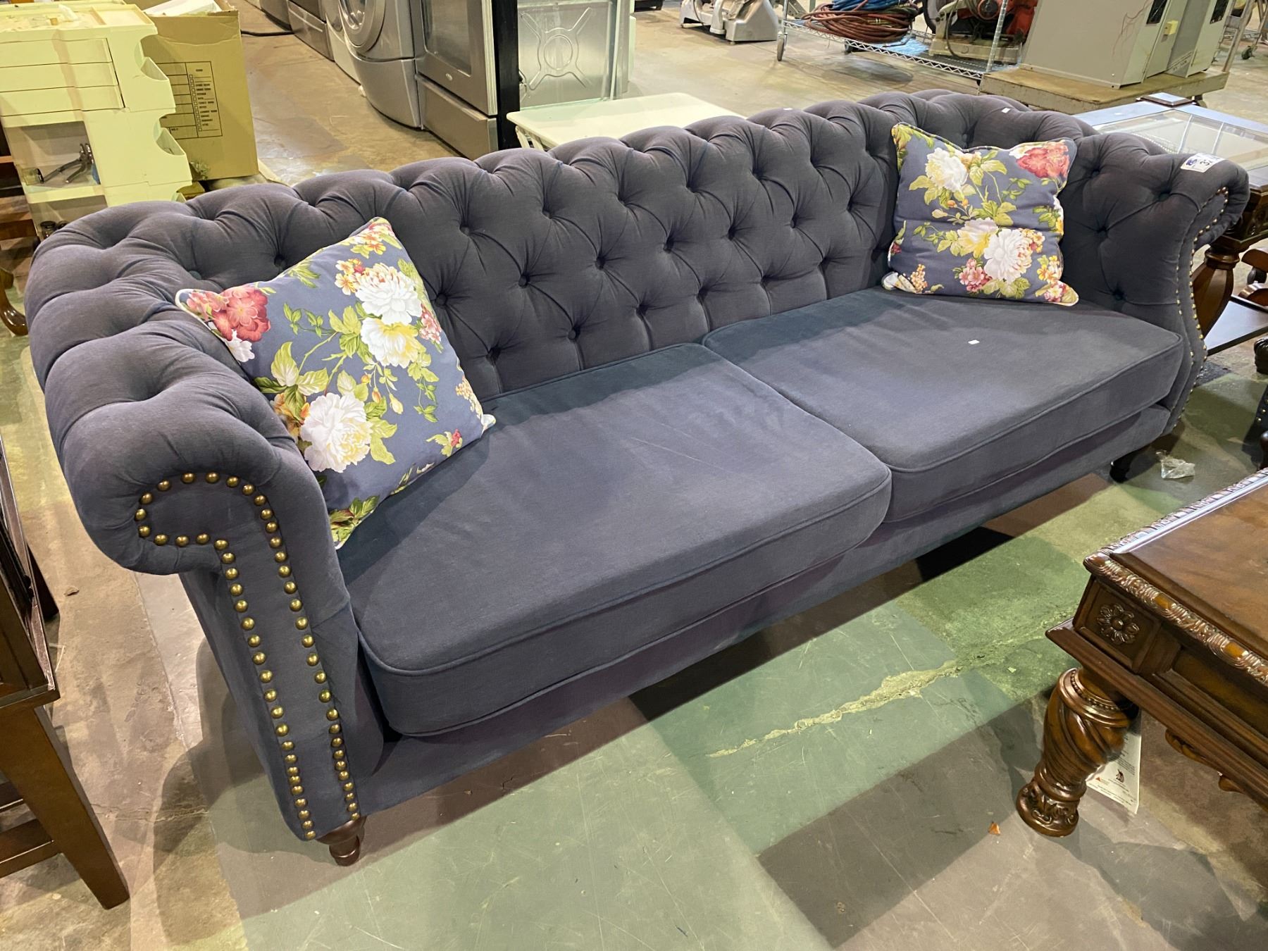 BLUE BUTTON BACK SOFA WITH 2 THROW FLORAL PRINT PILLOWS APPROX. 86" LONG