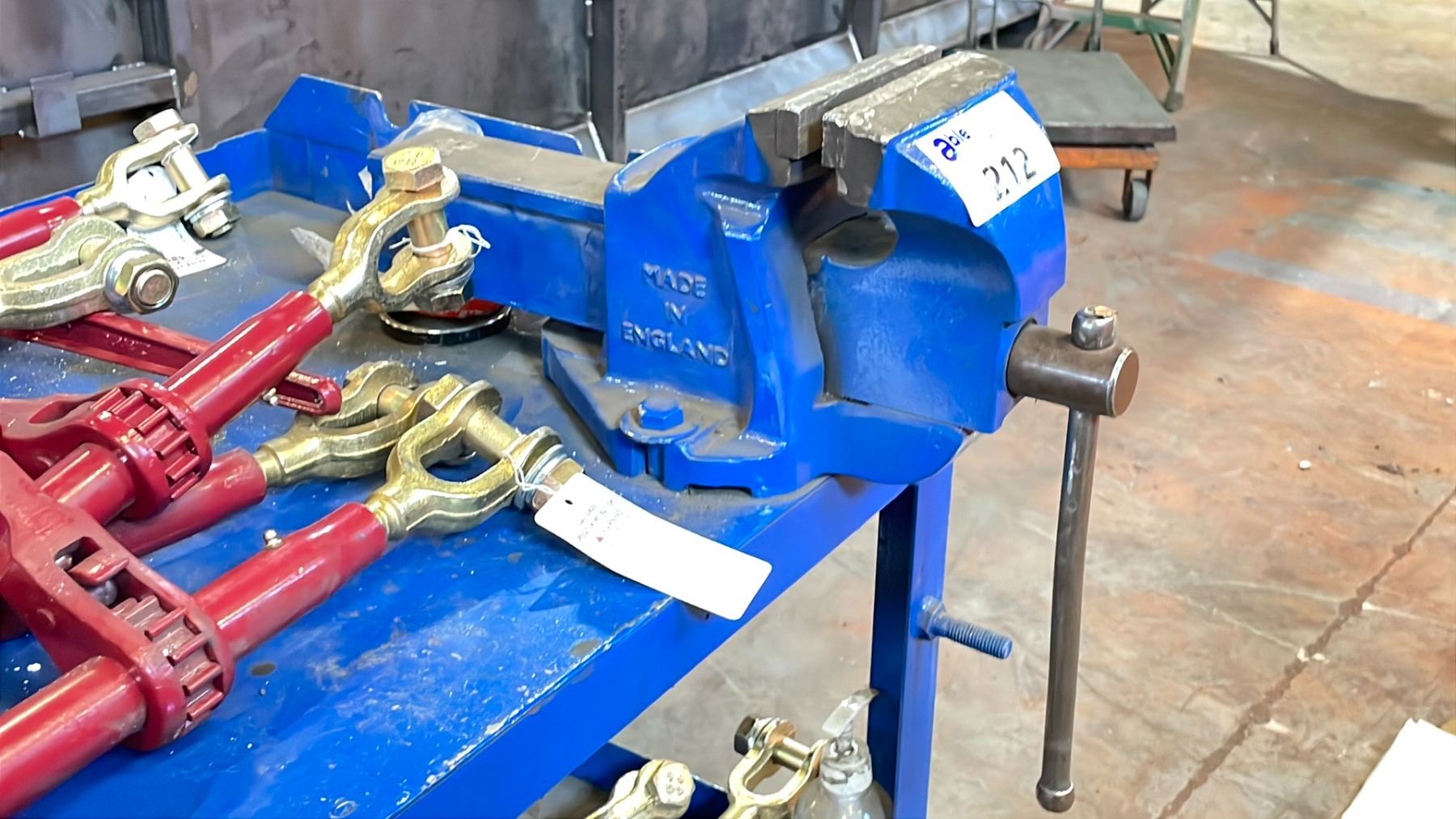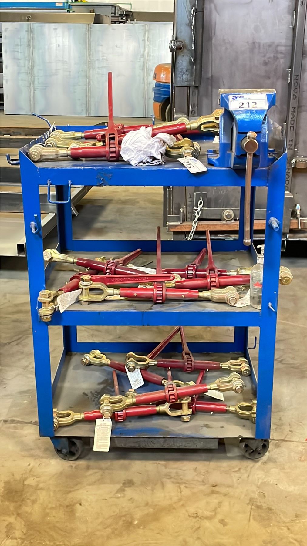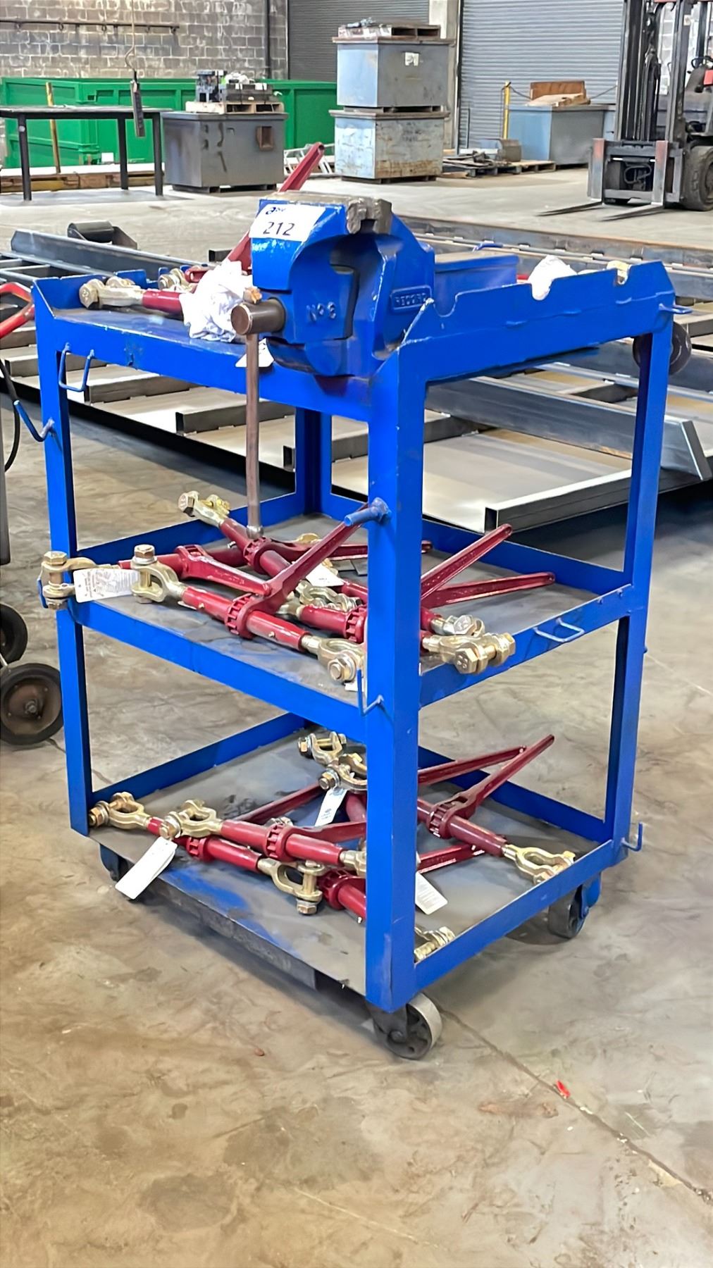 BLUE HEAVY DUTY METAL 3 SHELF ROLLING CART WITH VISE ATTACHED *CONTENTS NOT INCLUDED *