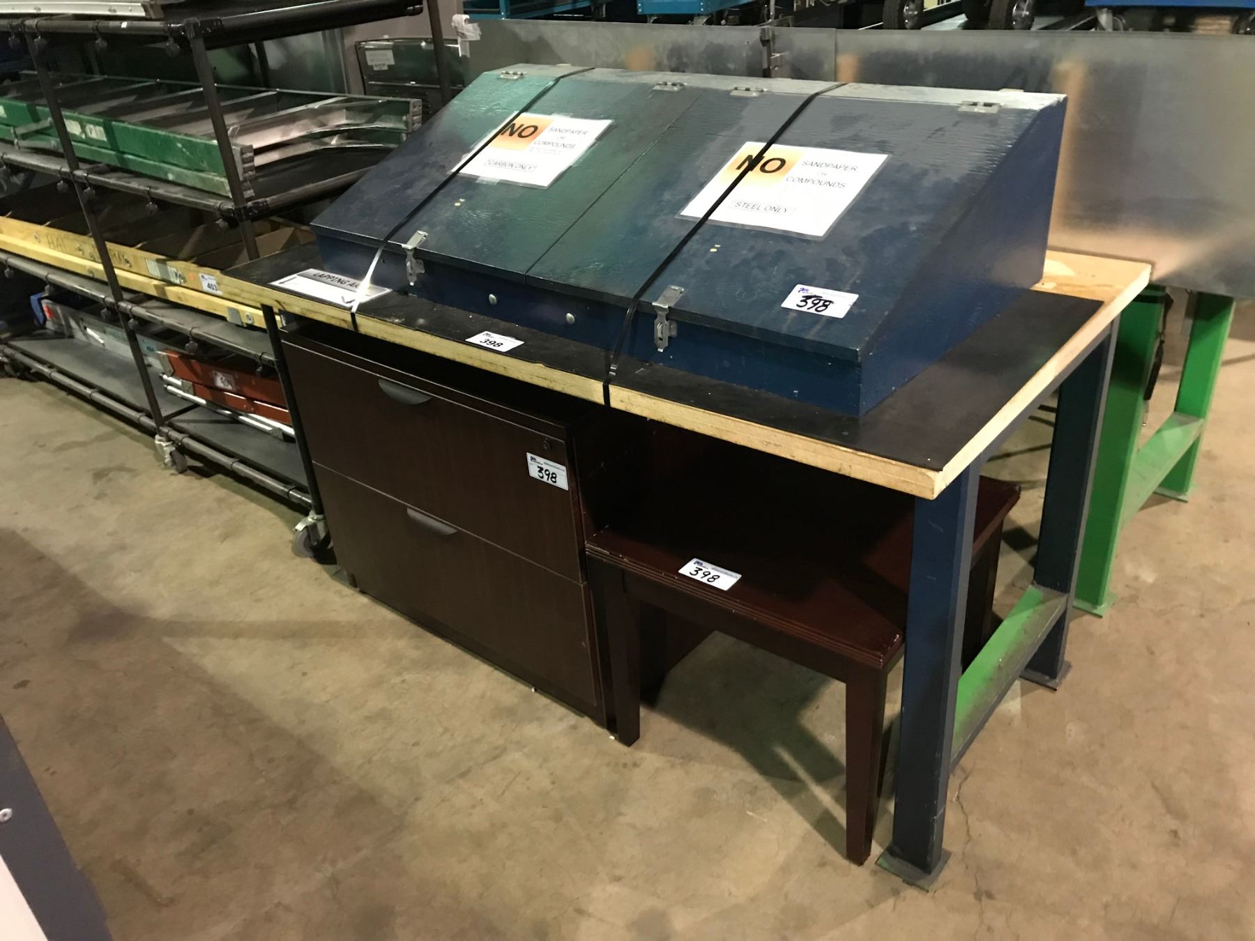 BLUE METAL 2 DOOR STORAGE WORK BENCH WITH CHERRY 2 DRAWER LATERAL FILE CABINET & TABLE