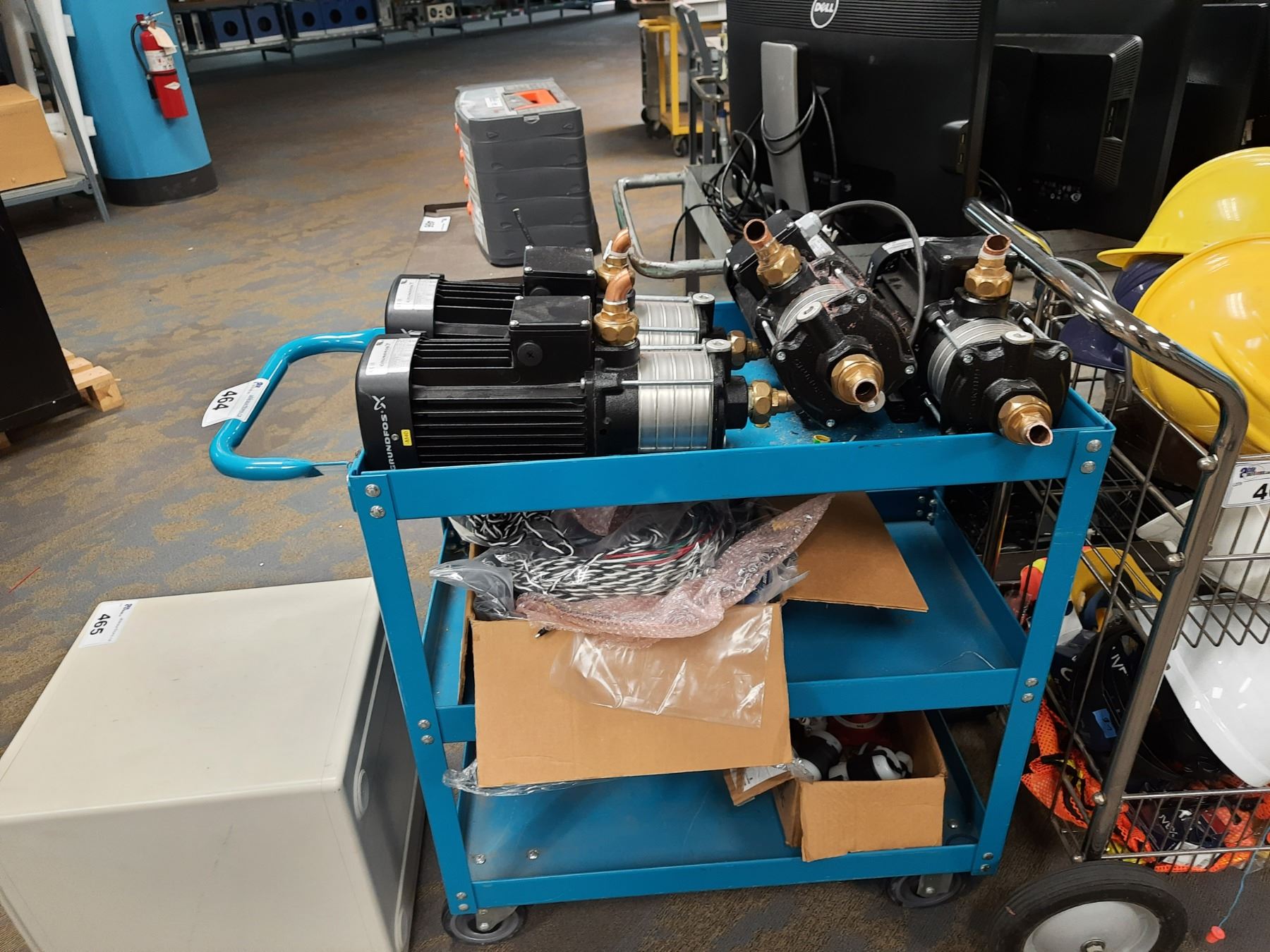 BLUE METAL 3 TIER PRODUCT CART WITH CONTENTS OF ASSORTED PUMPS AND ELECTRICAL HARDWARE