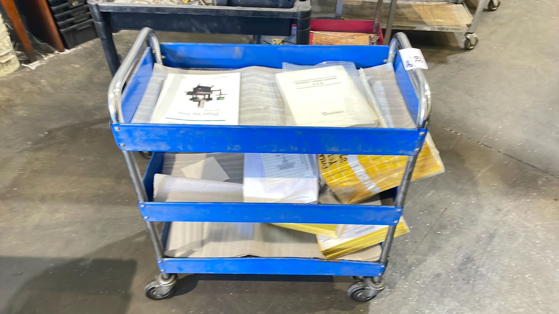 BLUE METAL 30"W X 16"D X 36"H INDUSTRIAL 3 TIER MOBILE PRODUCT CART WITH CONTENTS