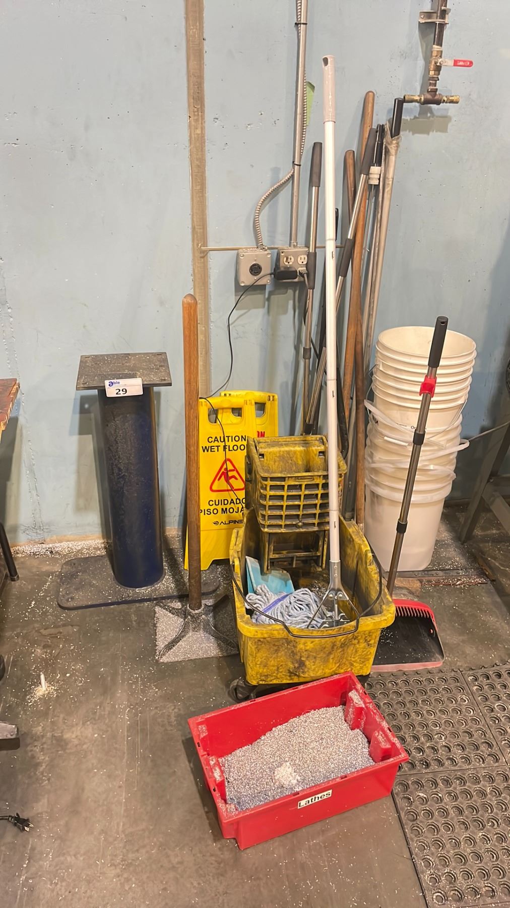 BLUE METAL HEAVY DUTY GRINDER STAND, ASSORTED JANITORIAL EQUIPMENT, & BUCKETS