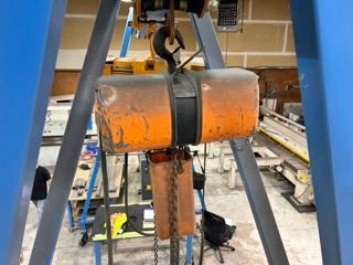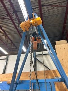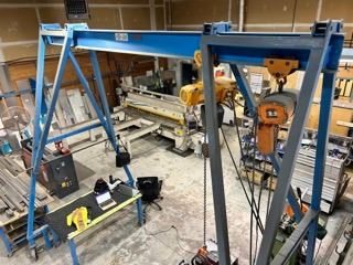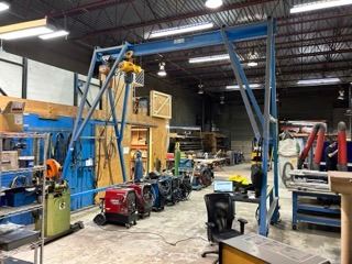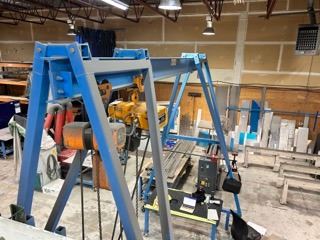 *BLUE METAL INDUSTRIAL OVERHEAD CRANE SYSTEM INCLUDING: JET 2 TON ELECTRIC SHOP CRANE WITH HAND CONTROLS & KITO CORP 1 TON ELECTRIC SHOP CRANE WITH HAND CONTROLS *MUST HAVE PROPER EQUIPMENT AND PERSONNEL FOR REMOVAL*