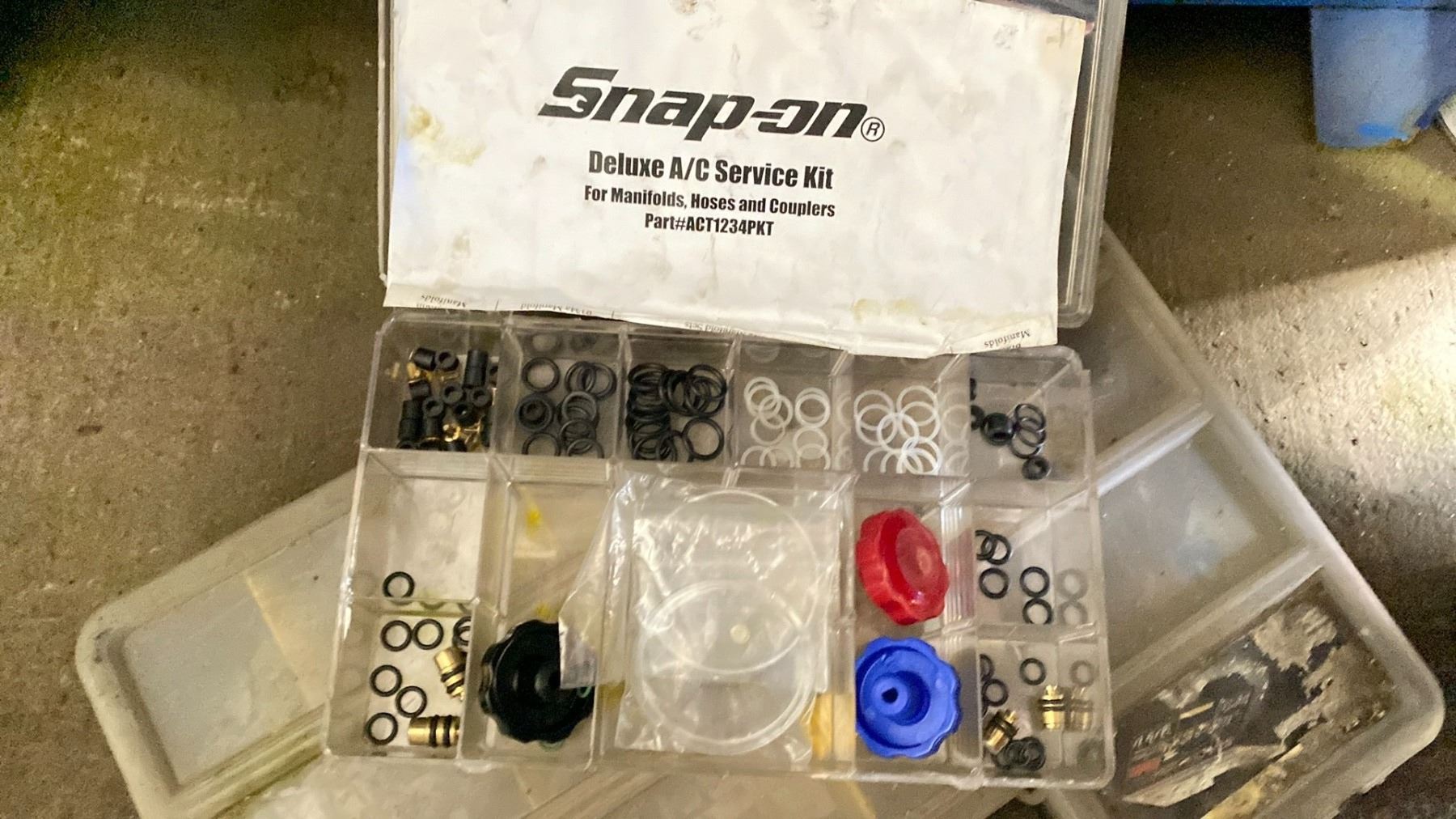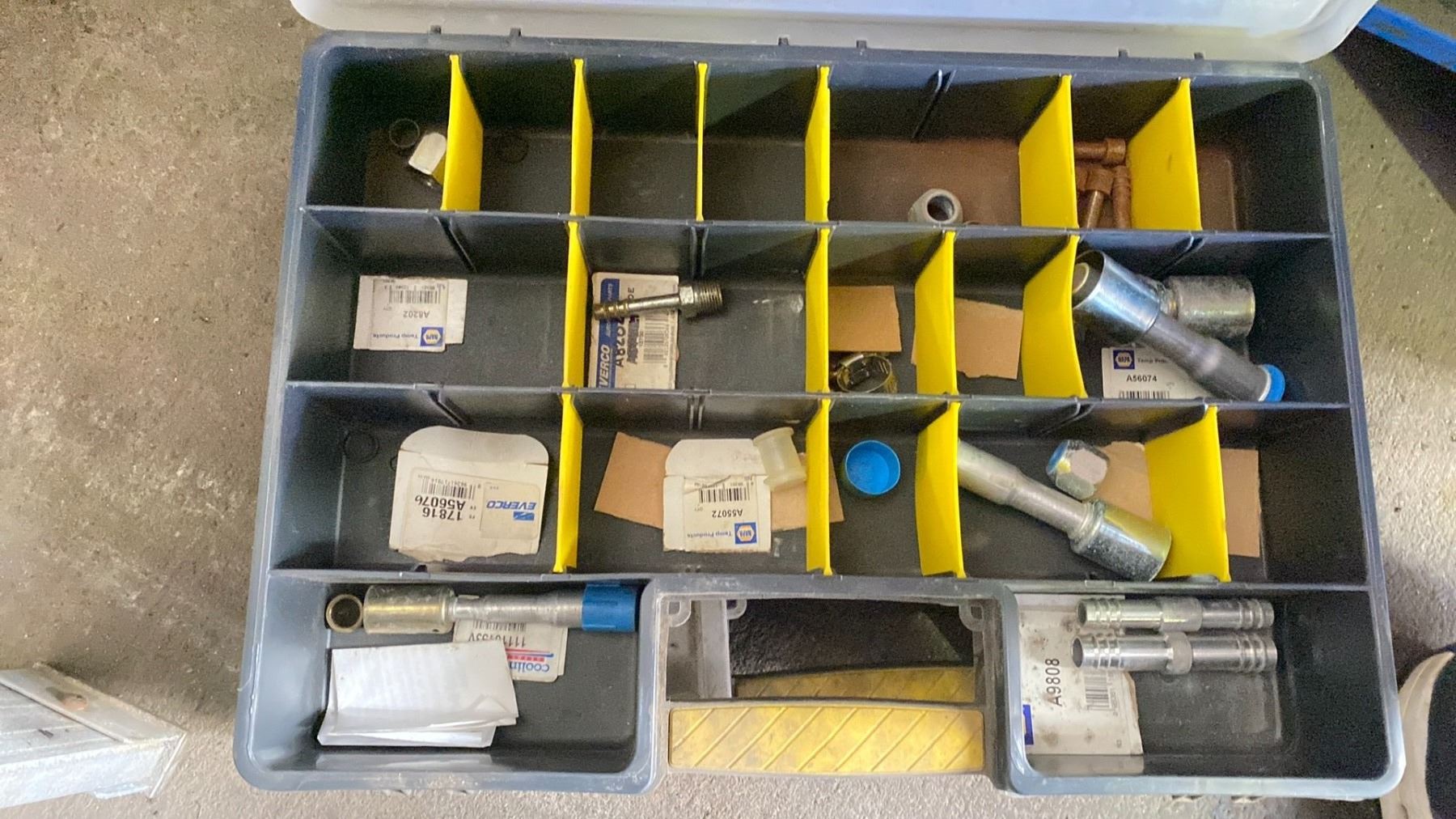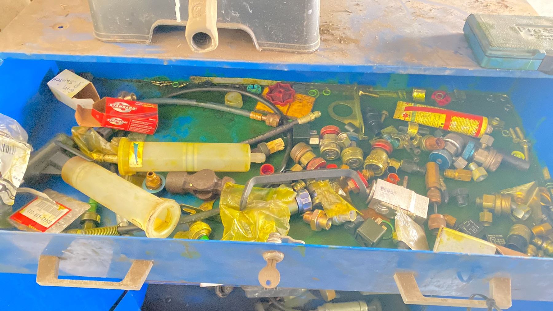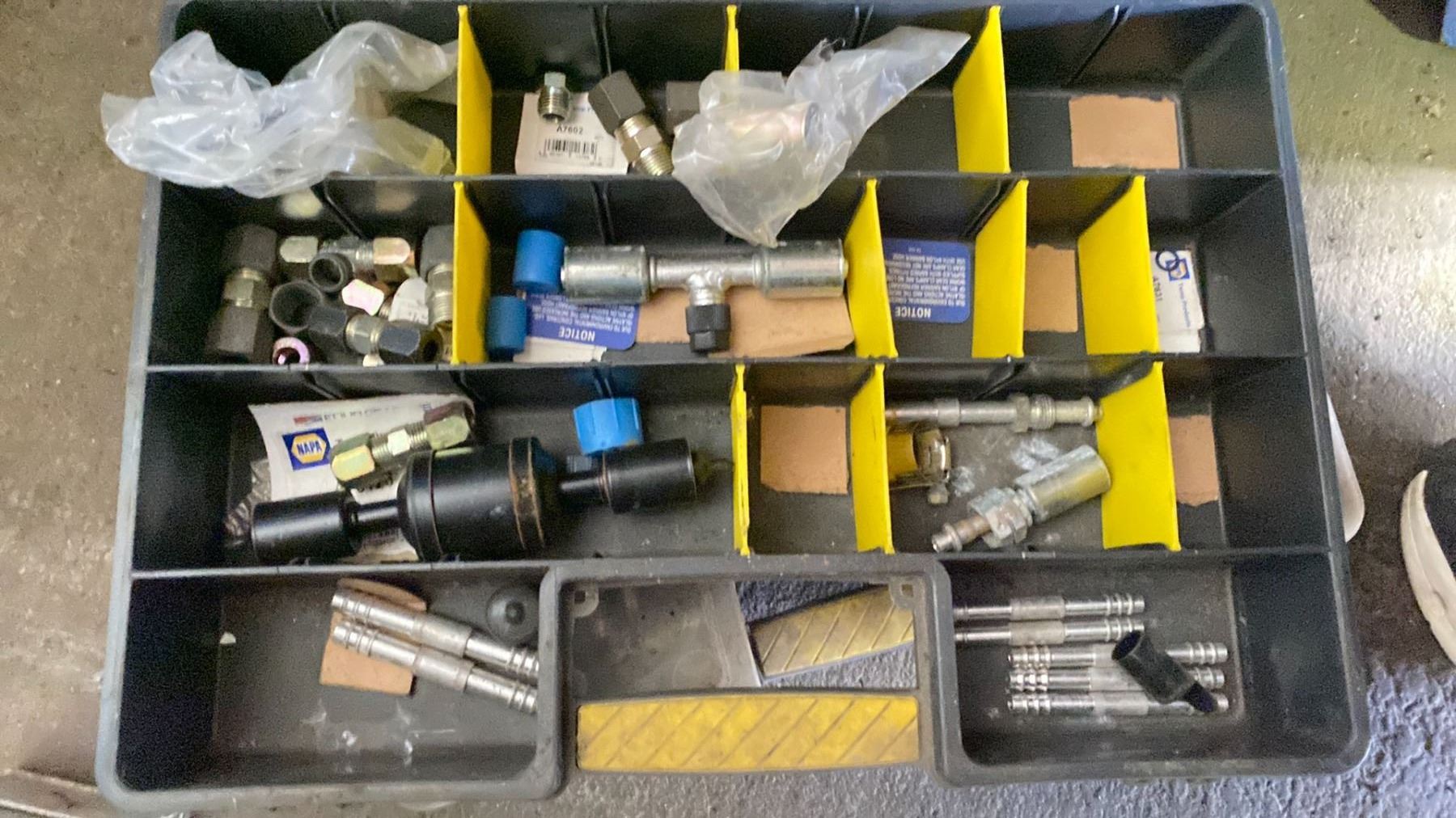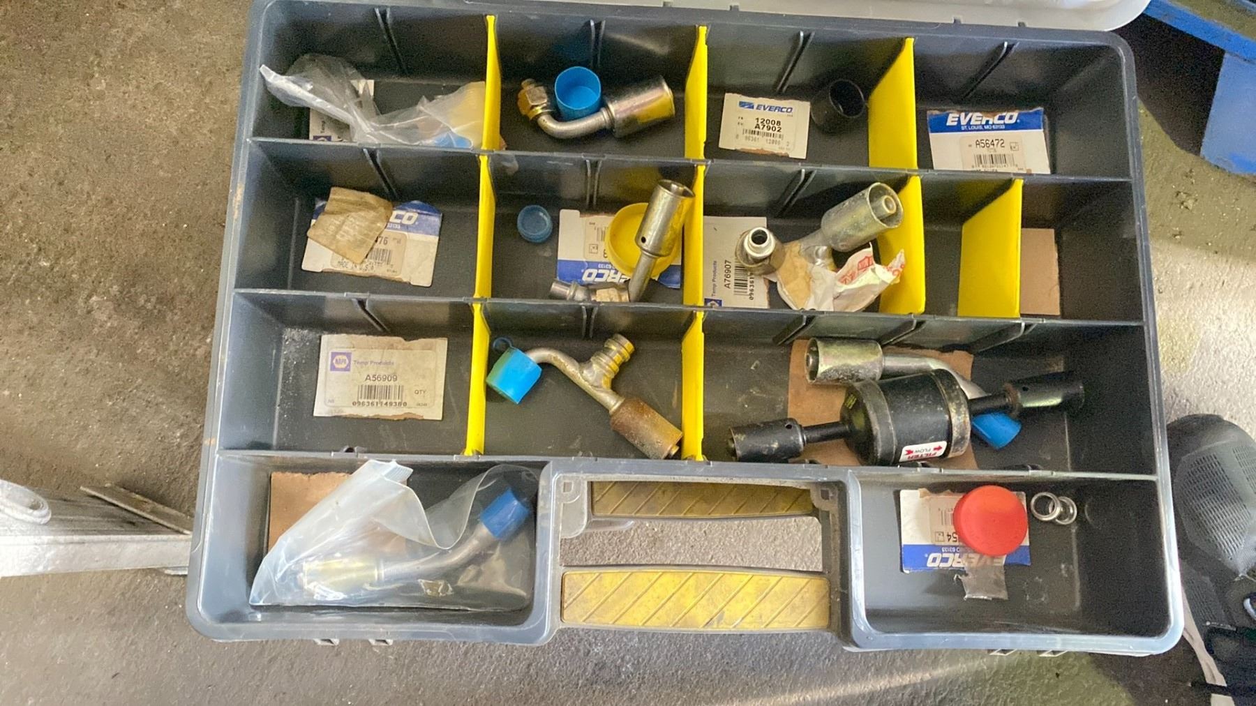 BLUE METAL TOOL BOX WITH CONTENTS. PRO-SET R-134A RETROFIT KIT, PILES OF A/C HOSE COMPONENTS, TEST FITTINGS, SNAP-ON O-RINGS AND SEALS, ETC