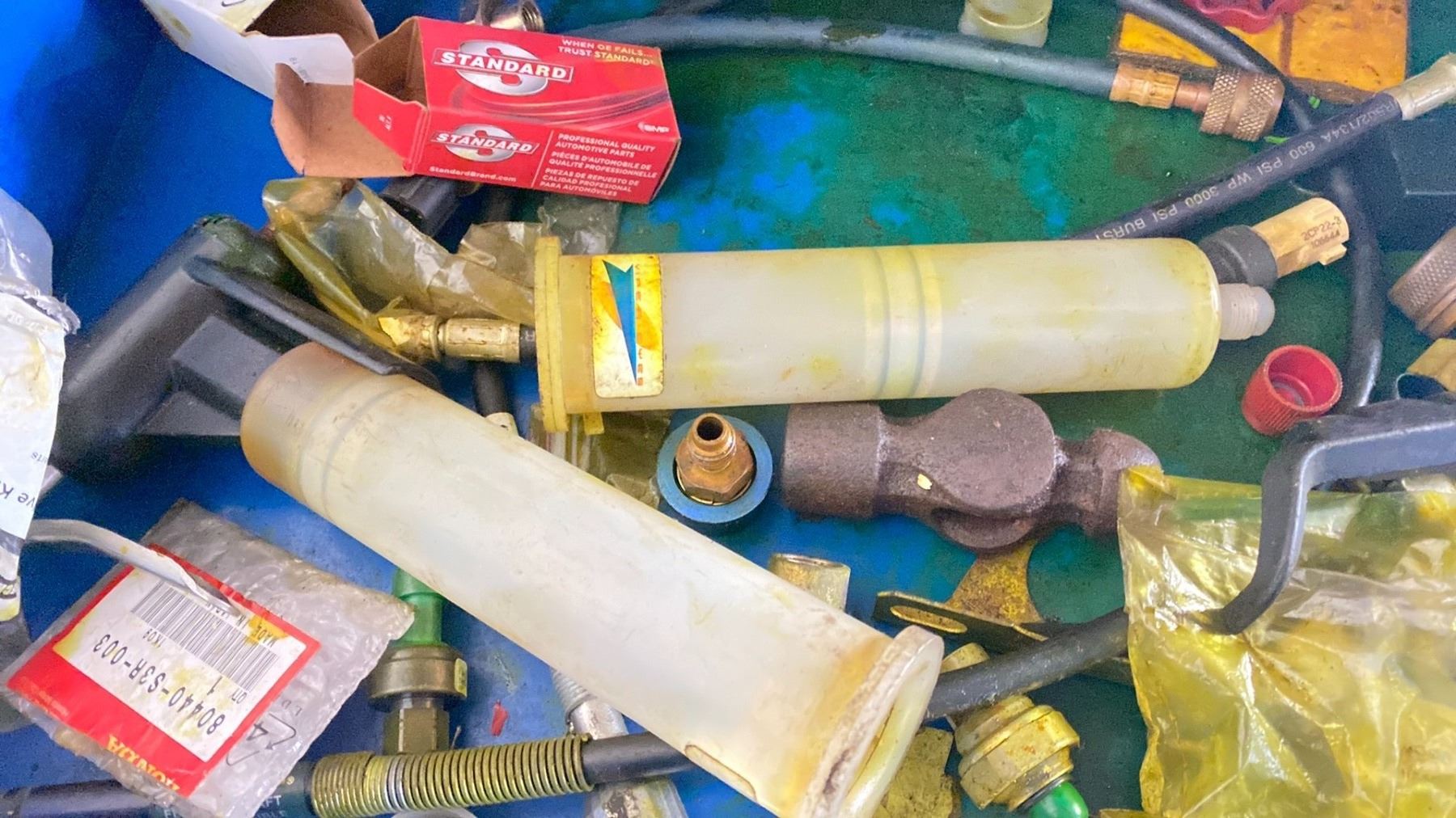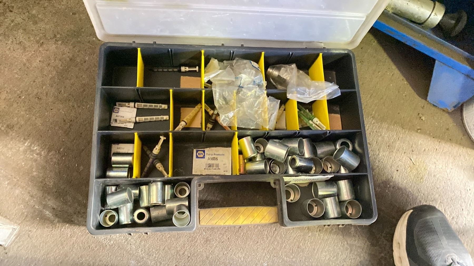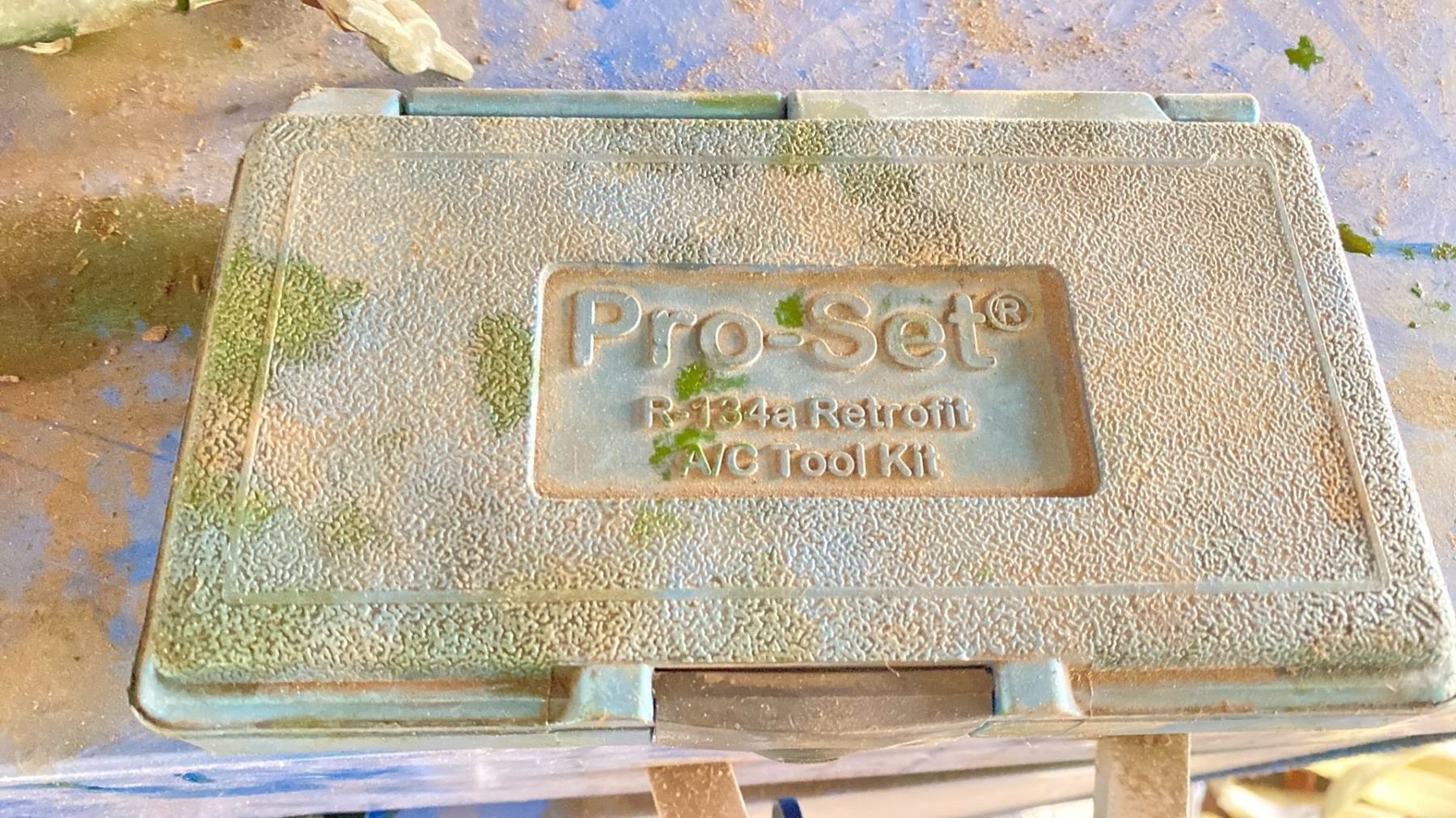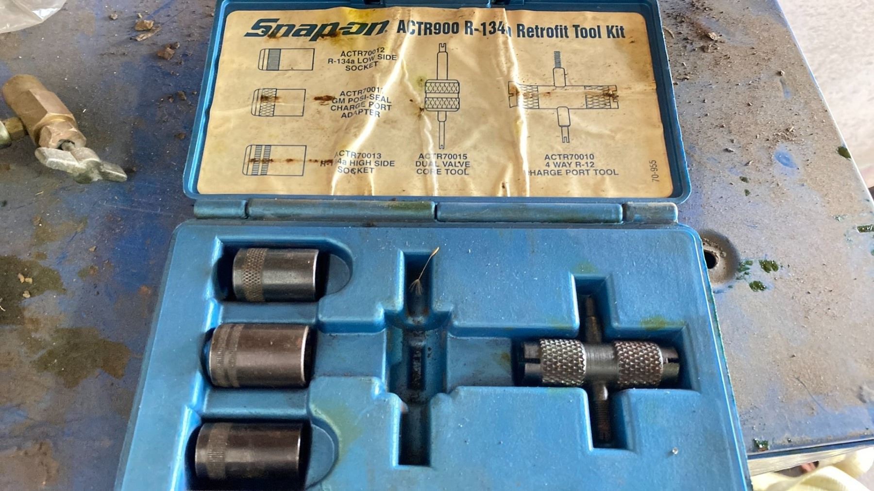 BLUE METAL TOOL BOX WITH CONTENTS. PRO-SET R-134A RETROFIT KIT, PILES OF A/C HOSE COMPONENTS, TEST FITTINGS, SNAP-ON O-RINGS AND SEALS, ETC
