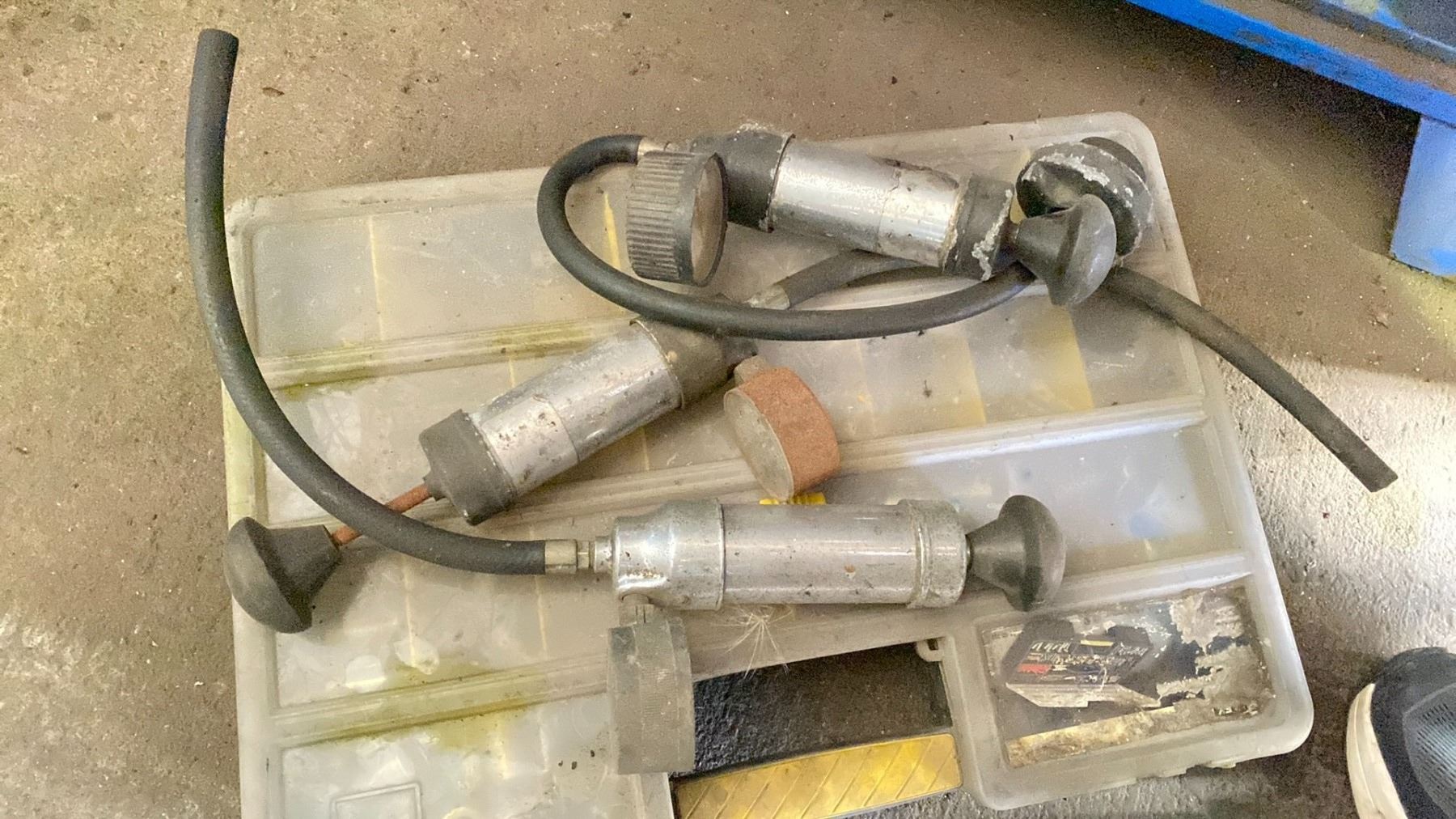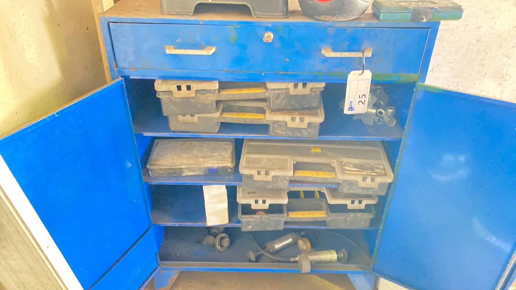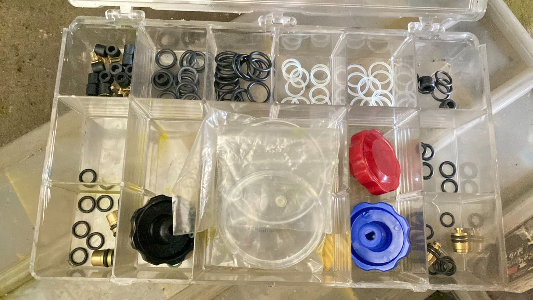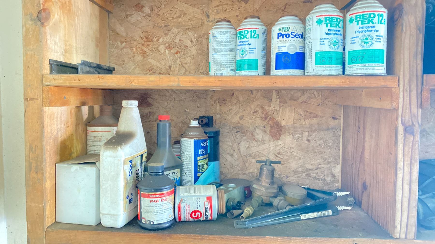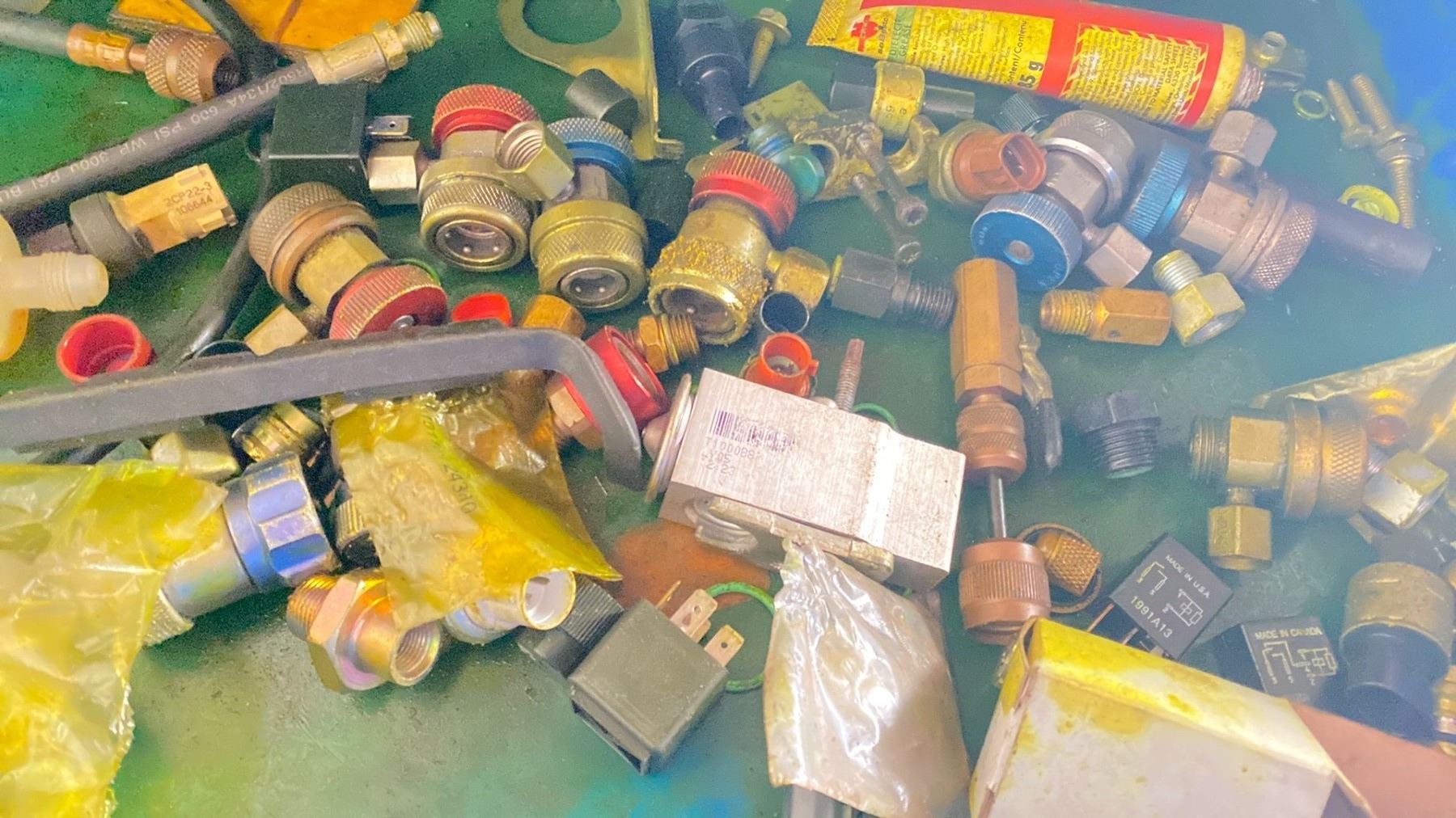 BLUE METAL TOOL BOX WITH CONTENTS. PRO-SET R-134A RETROFIT KIT, PILES OF A/C HOSE COMPONENTS, TEST FITTINGS, SNAP-ON O-RINGS AND SEALS, ETC