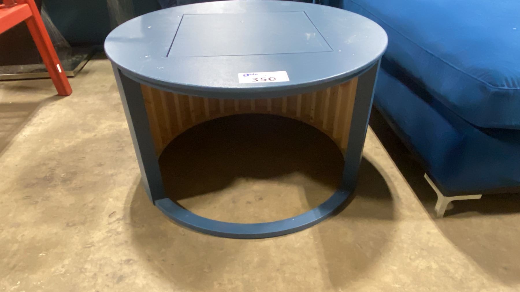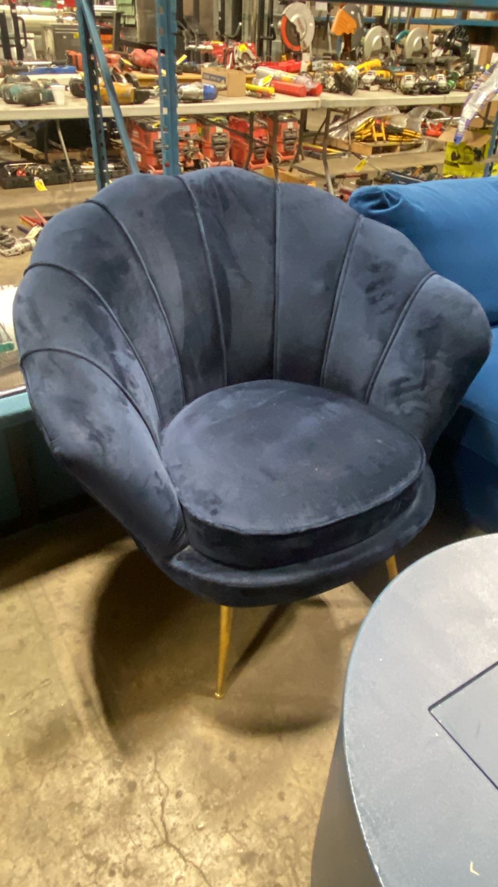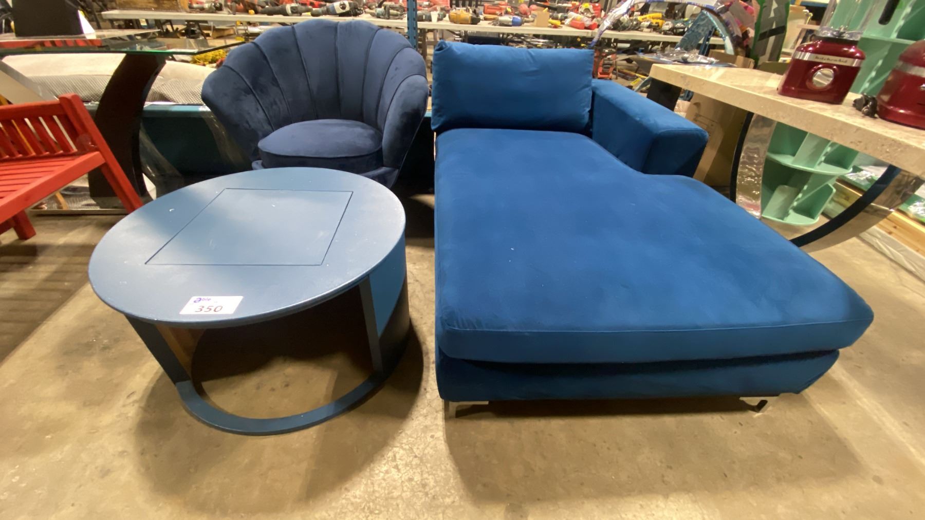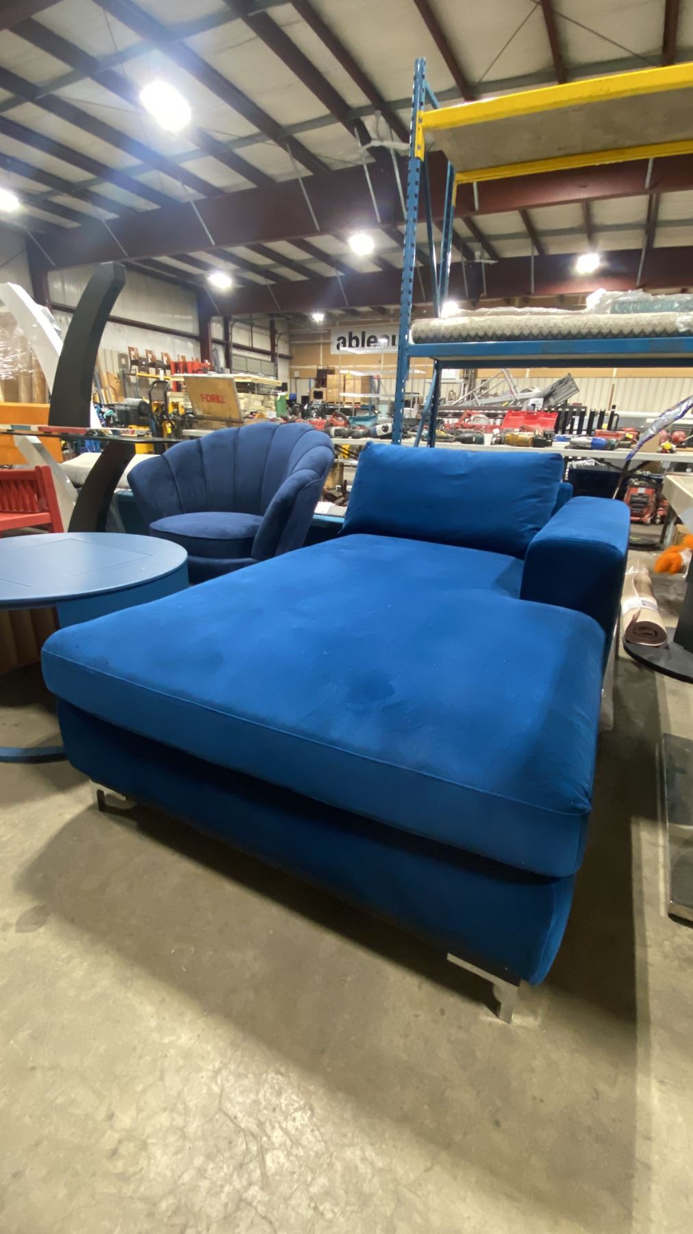 BLUE MICROFIBER CHAISE LOUNGE, BLUE MICROFIBER SHELL CHAIR & BLUE ROUND COCKTAIL TABLE