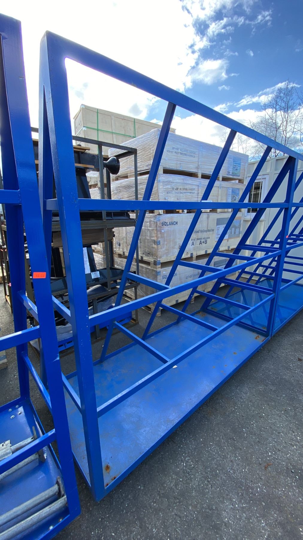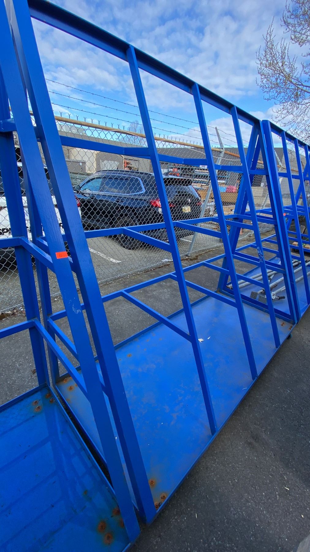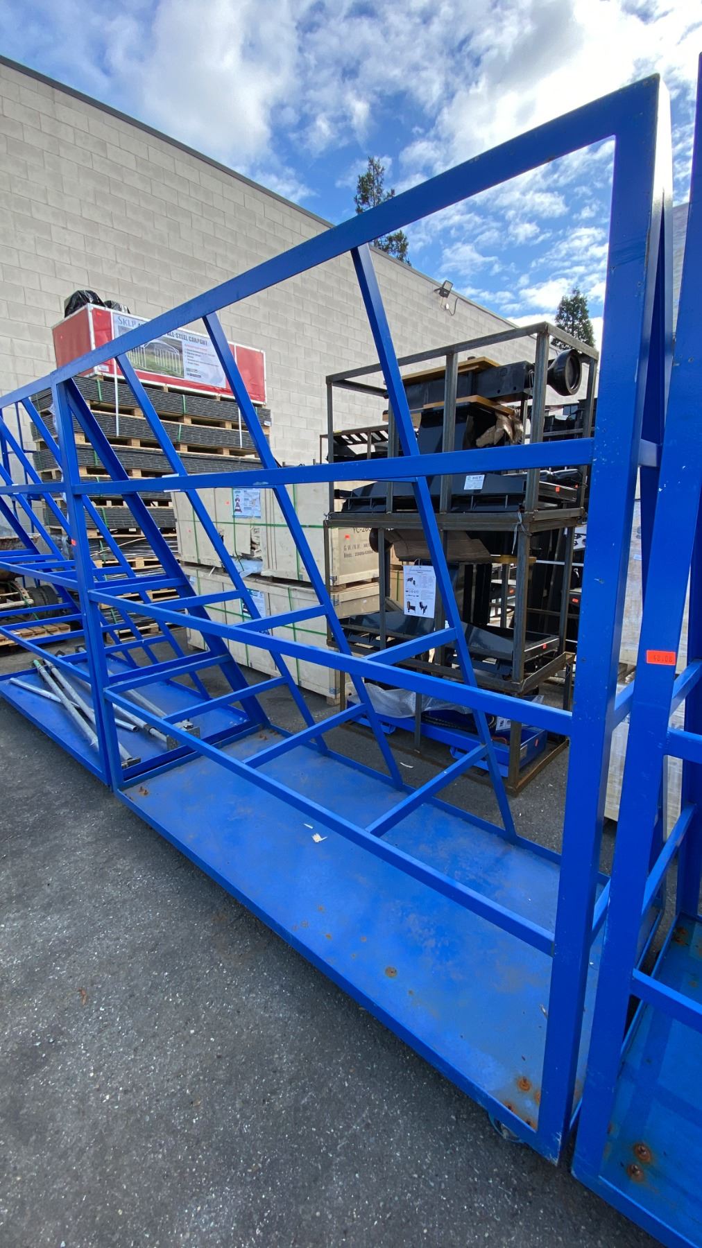 BLUE MOBILE ANGLED INDUSTRIAL MATERIAL RACK APPROX 7'L X 3'D X 6' 7"H *LAST DAY REMOVAL*
